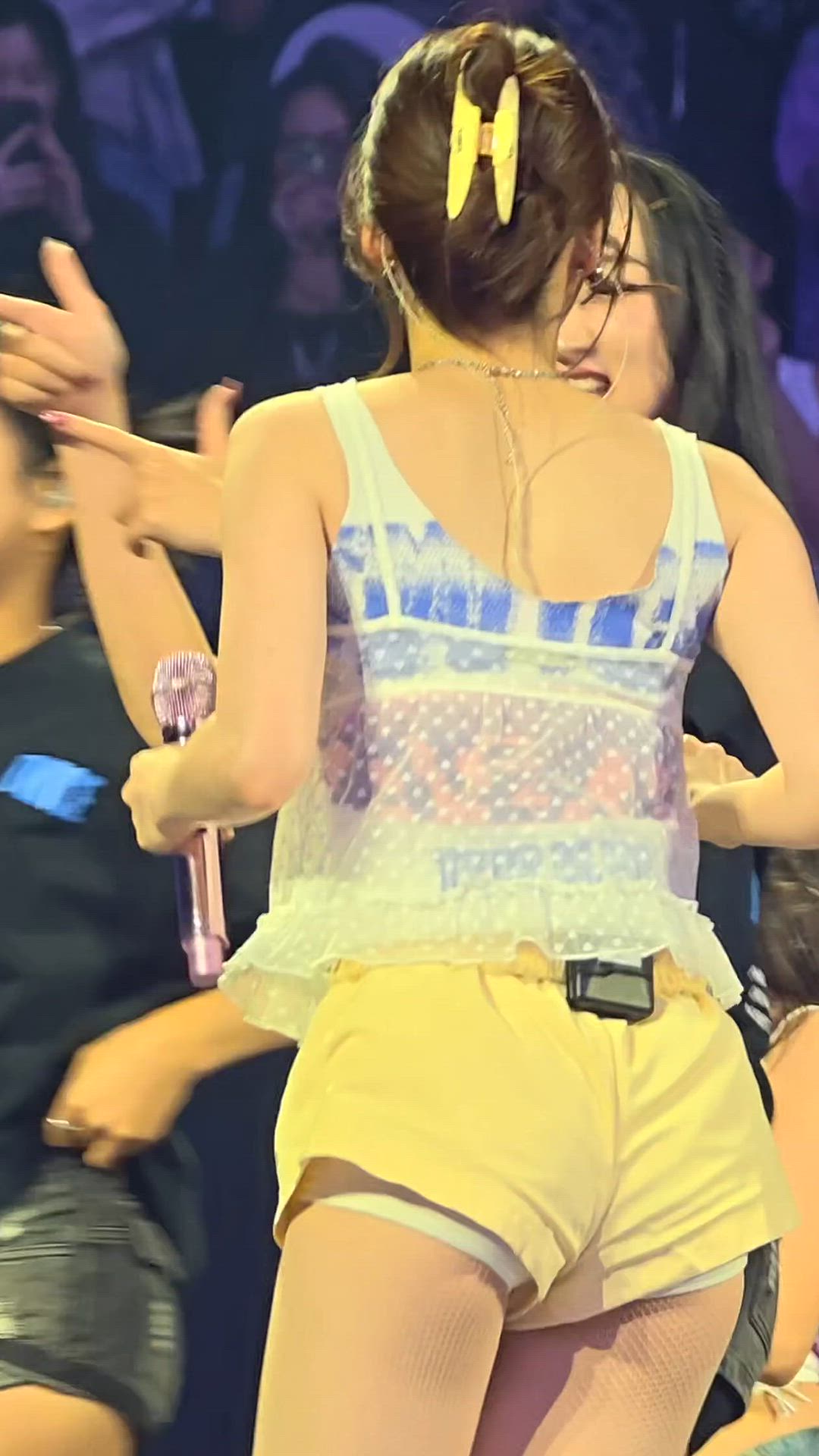 Sana showcases a lively and active charm on stage, pairing a sheer top with shorts. She creates a vibrant and lovely concert fashion look by utilizing bright-colored items. The lightweight top and short bottoms are particularly suitable for dynamic performances, exuding individuality perfect for a festival look.