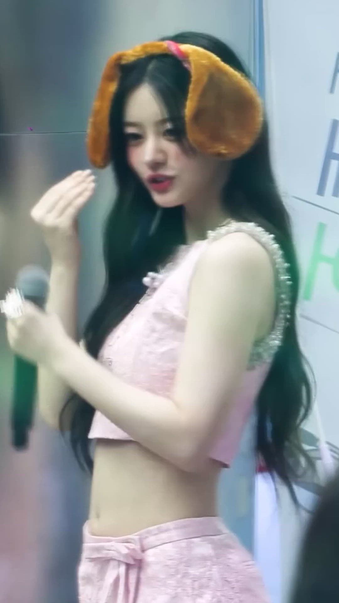 Minju from ILLIT presents a very cute and lively atmosphere with a lovely pink two-piece outfit. The top is a sleeveless crop design that emphasizes the waistline, while delicate lace details and pearl embellishments along the shoulders add a charming appeal. The bottom is a matching mini skirt with a tie-waist detail and subtle lace pattern, creating a cohesive and adorable style. She completes the look with a dog ear headband, showcasing the distinctive charm of K-pop idol fashion.