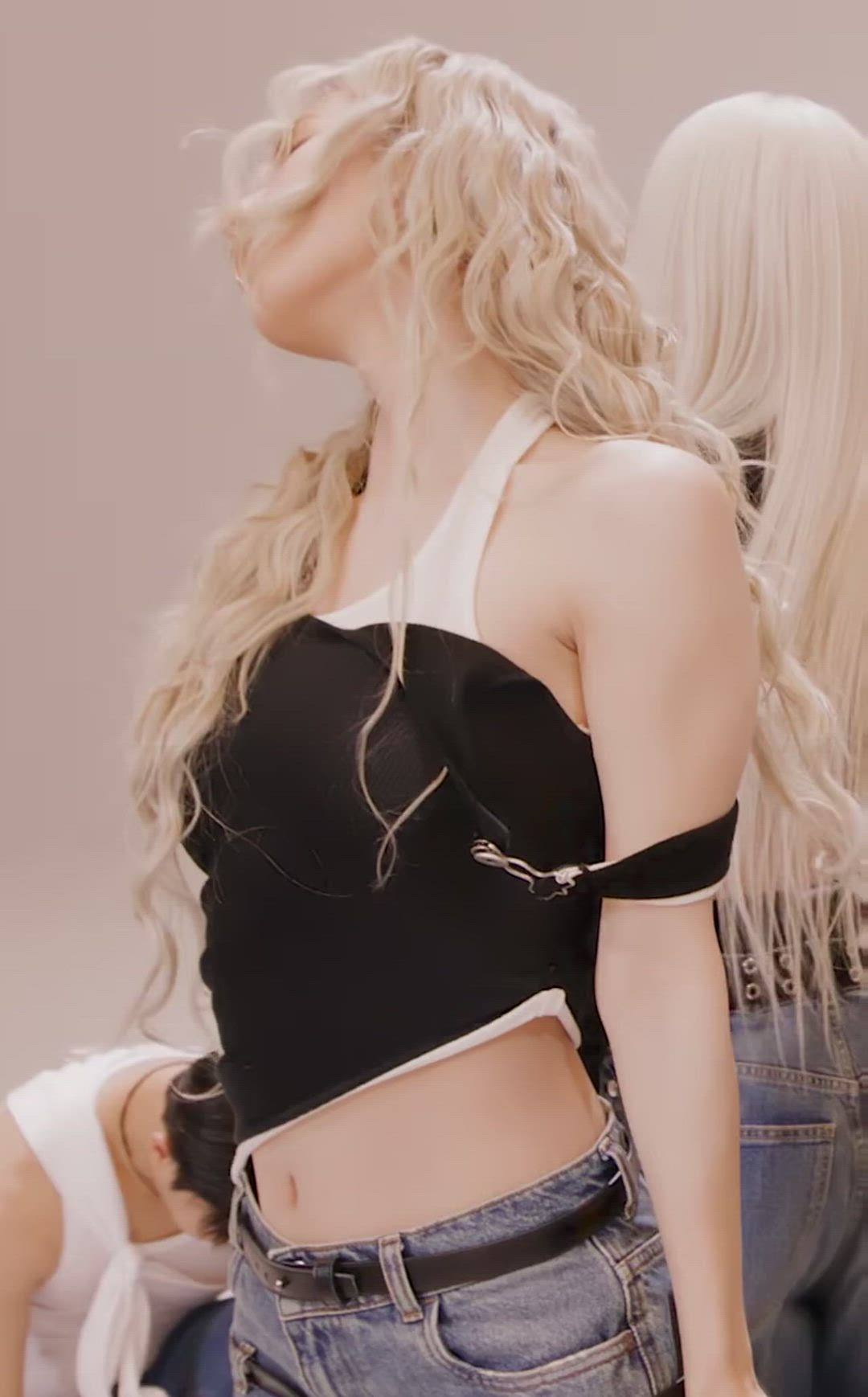 미연은 디자이너 패션 감각이 돋보이는 모던하고 시크한 스타일링을 선보입니다. 블랙과 화이트 컬러 블록의 크롭탑과 데님 팬츠를 매치하여 편안하면서도 세련된 매력을 연출합니다. 특히 상의의 독특한 디자인과 허리 라인을 강조하는 데님 스타일의 조합이 인상적입니다. 전체적으로 활동적이면서도 개성 있는 아이돌 패션 트렌드를 잘 보여줍니다.