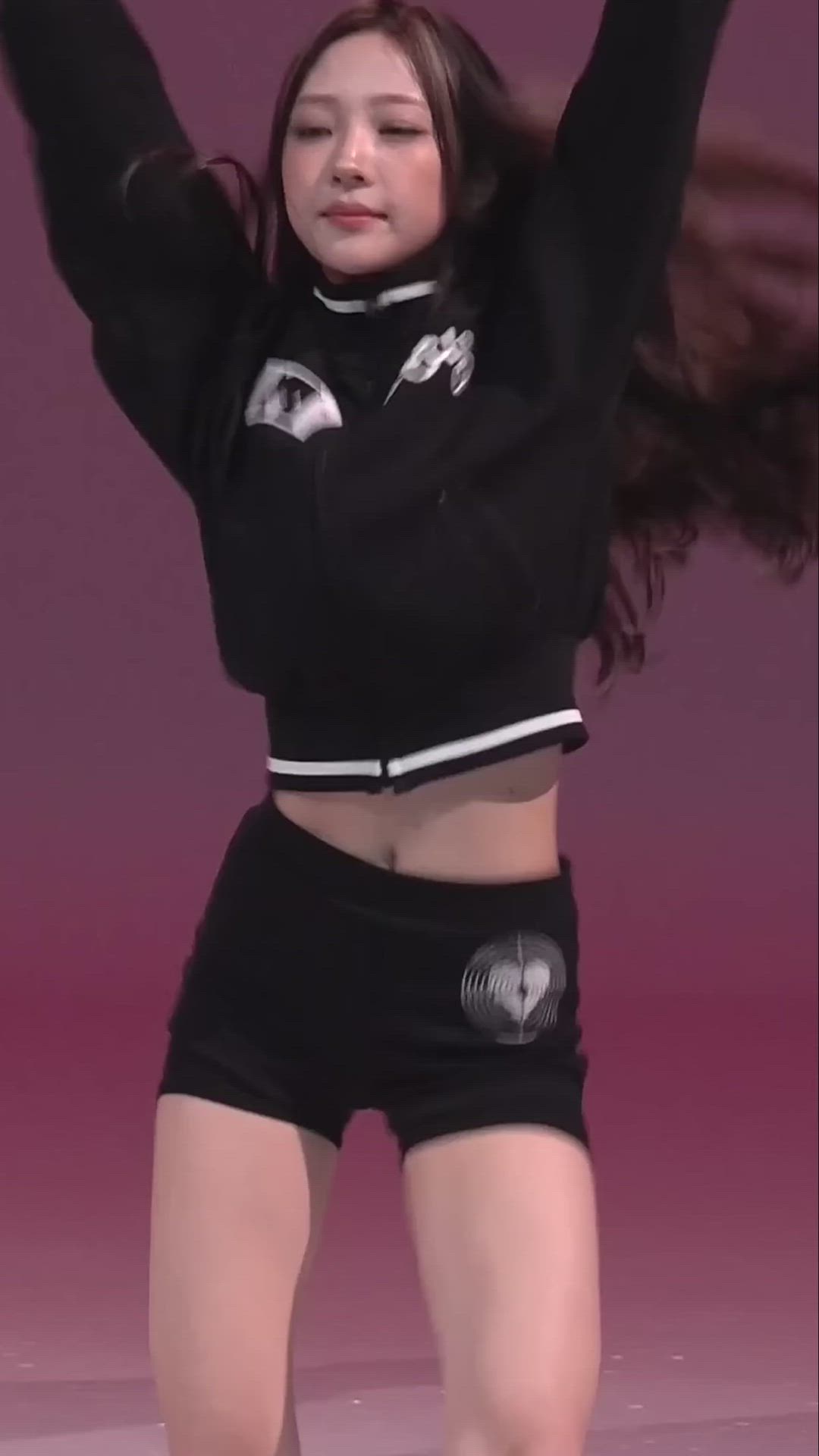 스텔라는 역동적인 안무에 최적화된 애슬레저 스타일의 퍼포먼스 웨어를 착용하고 있습니다. 블랙 컬러의 크롭 재킷과 쇼츠로 구성된 의상은 활동성을 강조하며, 세련되고 강렬한 인상을 줍니다. 특히 상의의 깔끔한 화이트 라인 디테일과 하의의 로고 포인트가 전체적인 룩에 현대적인 감각을 더합니다.