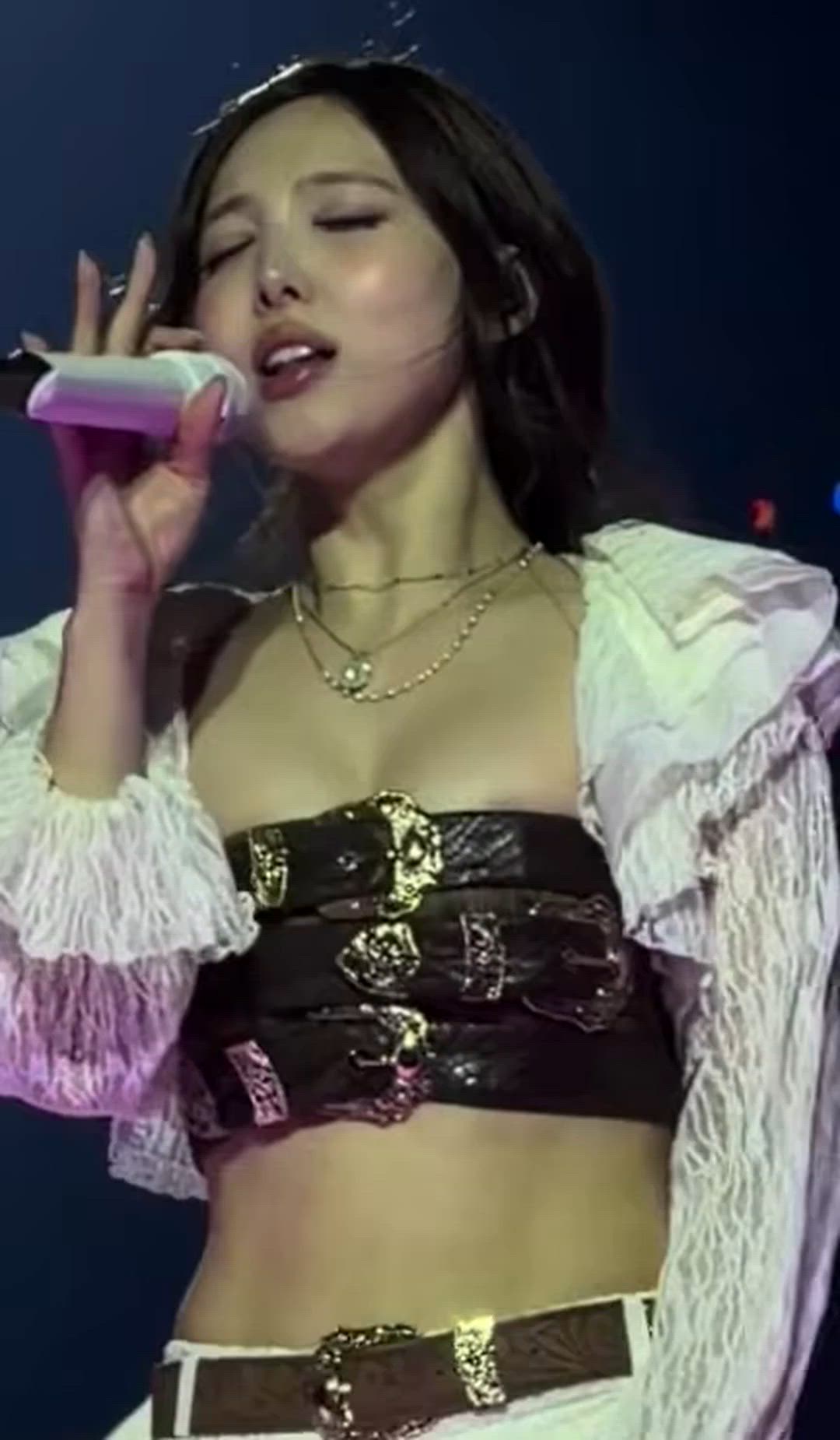 Nayeon presents a powerful and distinctive outfit on stage. She layers a dark-colored corset-style top with a white ruffled blouse, exuding luxurious charm. The combination of multiple buckle embellishments and delicate lace details creates a harmonious and eye-catching stage ensemble.