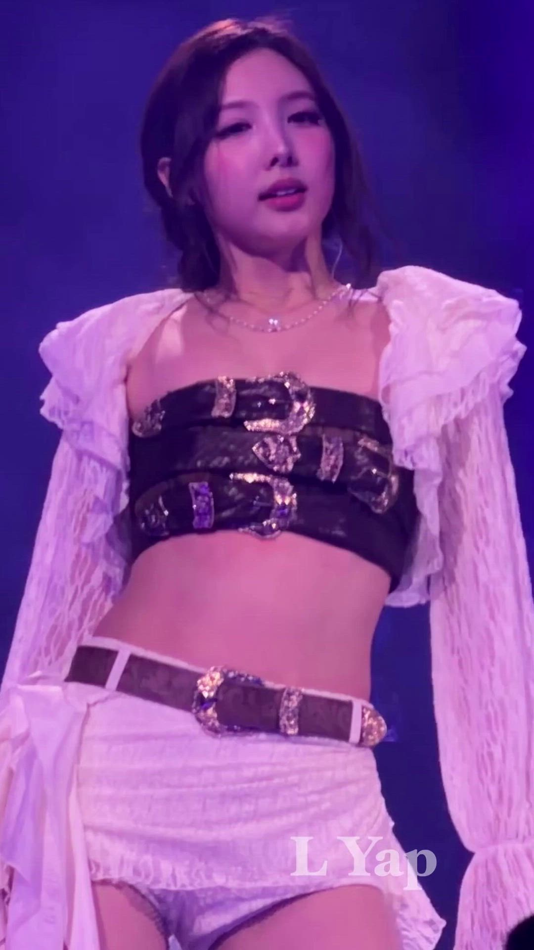TWICE Nayeon은 무대 의상으로 화려하면서도 독특한 스타일링을 선보입니다. 시스루 레이스 볼레로와 버클 디테일의 크롭 탑을 매치하여 대담하고 강렬한 인상을 주며, 하의는 밝은 색상의 미니 스커트로 전체적인 룩에 균형을 더합니다. 액세서리로는 장식적인 버클 벨트와 섬세한 목걸이를 착용하여 화려한 디테일을 강조하고 있습니다. 전반적으로 록 시크와 로맨틱한 요소가 결합된 듯한 고급스러운 분위기가 특징입니다.
