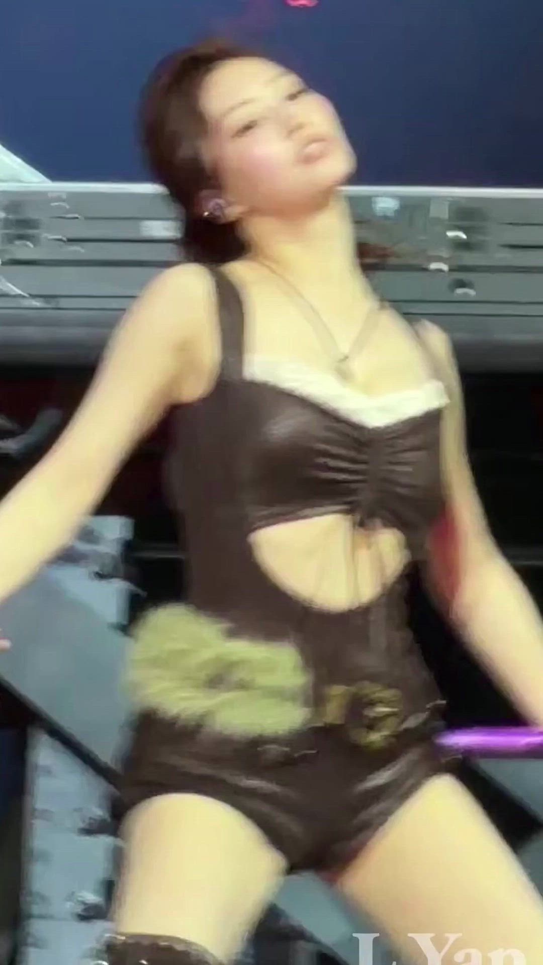 Momo showcases a powerful yet unique performance look with a dark brown, glossy set-up that stands out as a stage costume. The top is a corset-style piece featuring cutout details and shirring, paired with matching high-waisted shorts. The overall ensemble emphasizes the body line with its fitted design and distinctive material, creating an eye-catching performance attire.