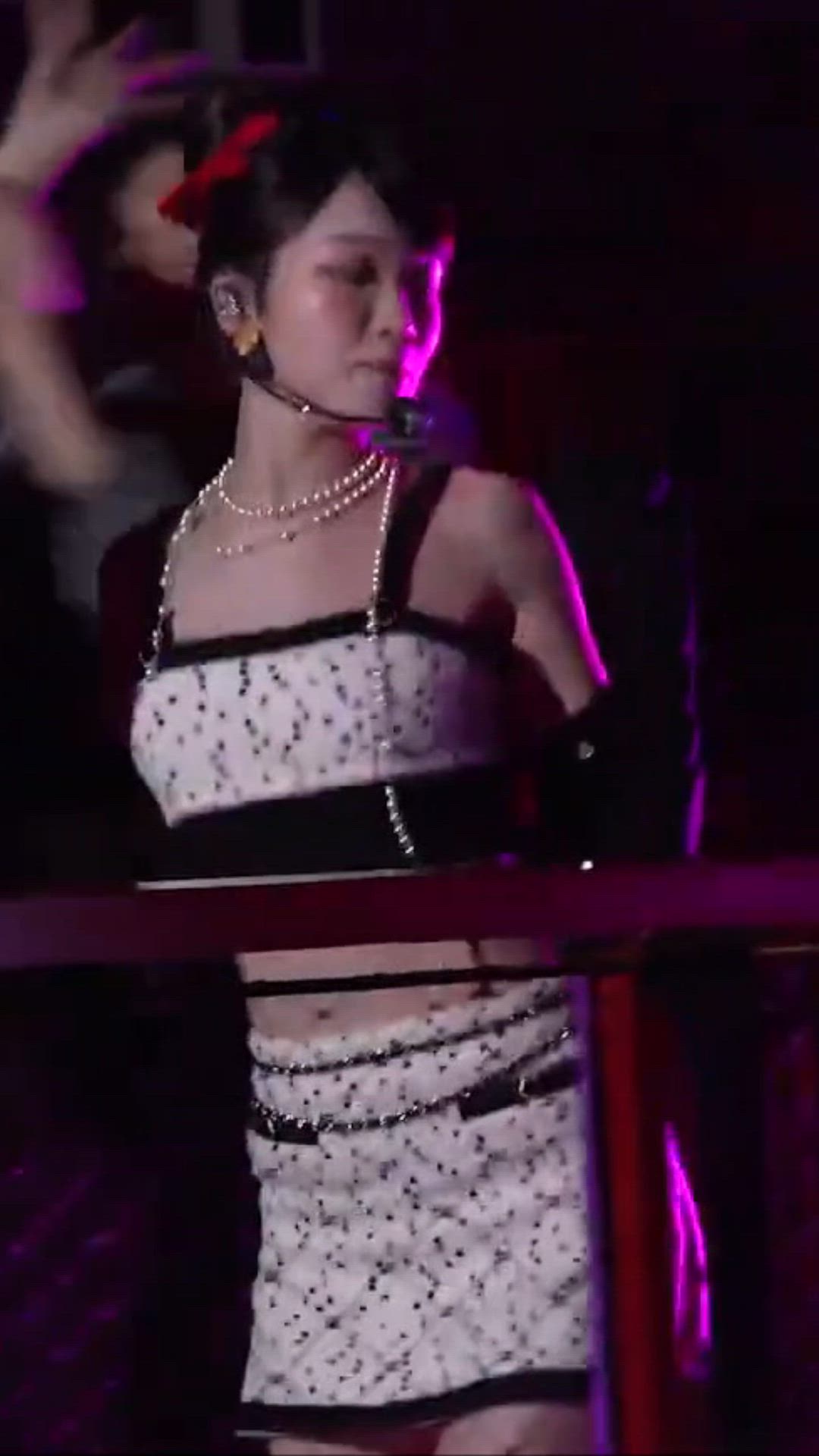 김채원님은 무대 위에서 화려하면서도 사랑스러운 매력을 강조하는 아이돌 의상을 선보였습니다. 흰색 바탕에 검은색 도트 패턴이 특징인 크롭 톱과 미니 스커트 셋업으로, 전체적으로 발랄하고 경쾌한 분위기를 연출합니다. 특히 진주 목걸이와 레드 리본 헤어 액세서리를 매치하여 룩에 포인트를 더했으며, 럭셔리 패션의 정교함이 돋보이는 디테일들이 어우러져 시선을 사로잡습니다.