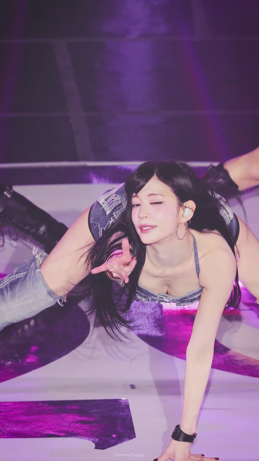 프로미스나인 이채영은 무대 위에서 강렬한 데님 패션을 선보입니다. 빈티지한 워싱과 디테일이 돋보이는 데님 홀터넥 상의와 쇼츠를 매치하여 활동적이면서도 스타일리시한 Y2K 스타일을 연출했습니다. 전체적으로 시원하고 힙한 분위기를 자아내며, 페스티벌 룩으로도 손색없는 개성 있는 착장입니다.