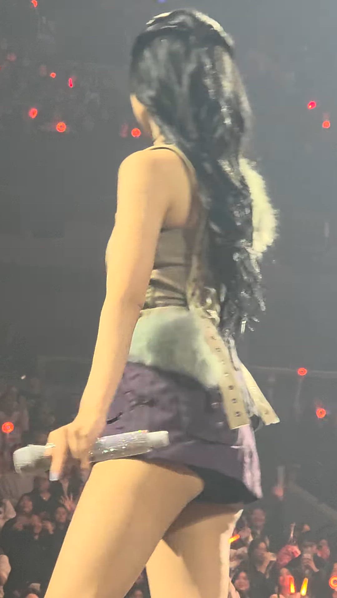 미나의 스테이지 의상은 카키색 계열의 상의와 보라색 미니 스커트로 구성되어 컨템포러리 패션의 매력을 발산합니다. 특히 상의에 레이어드된 듯한 디테일과 하의의 유니크한 디자인이 어우러져 럭셔리 스타일의 세련된 공연 복장을 완성합니다. 전반적으로 활동적이면서도 스타일리시한 분위기를 연출합니다.