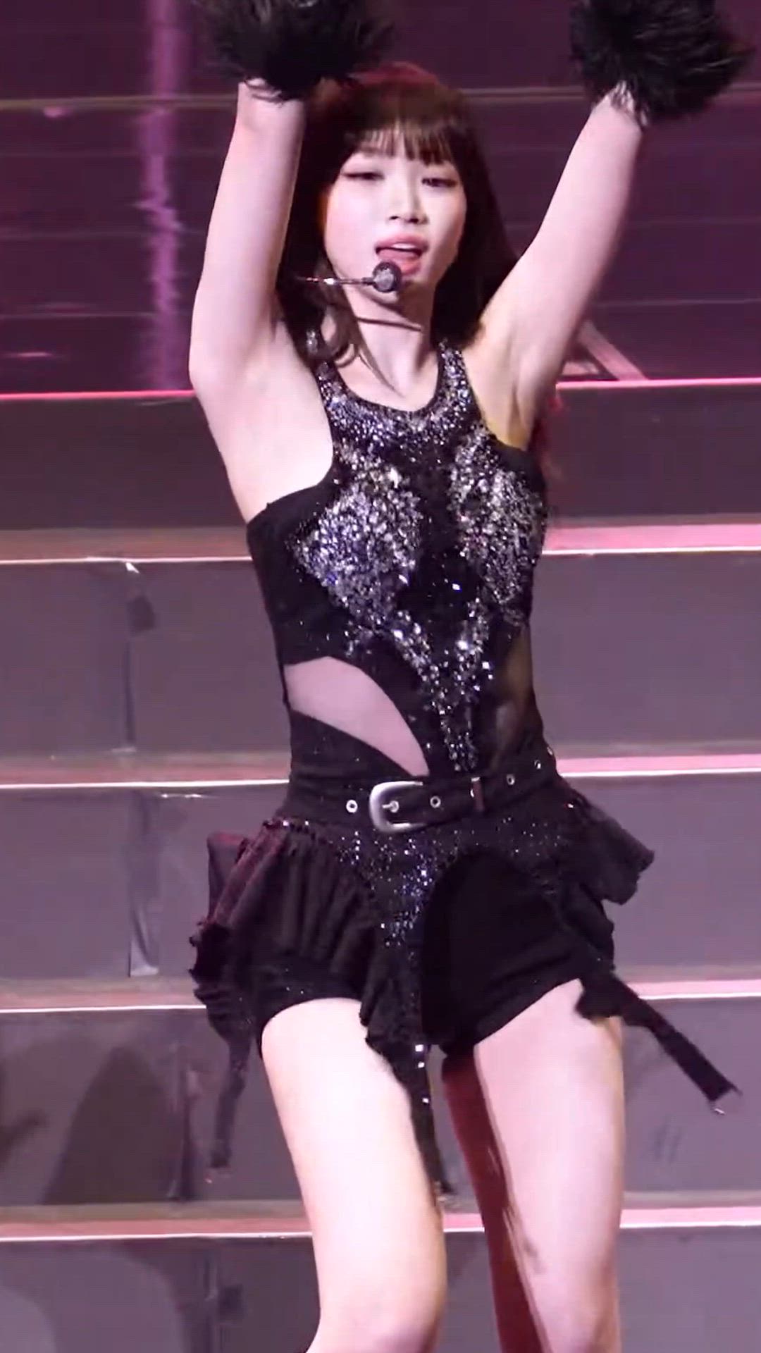 르세라핌 김채원은 무대 위에서 블링블링한 매력이 돋보이는 퍼포먼스 의상을 선보였습니다. 전체적으로 블랙 컬러를 바탕으로 한 의상에 화려한 스팽글과 글리터 디테일이 더해져 강렬하면서도 화려한 분위기를 연출합니다. 몸에 밀착되는 핏과 과감한 컷아웃, 그리고 반짝이는 소재의 조화가 무대 위에서 시선을 사로잡는 스타일리시한 룩을 완성하고 있습니다.