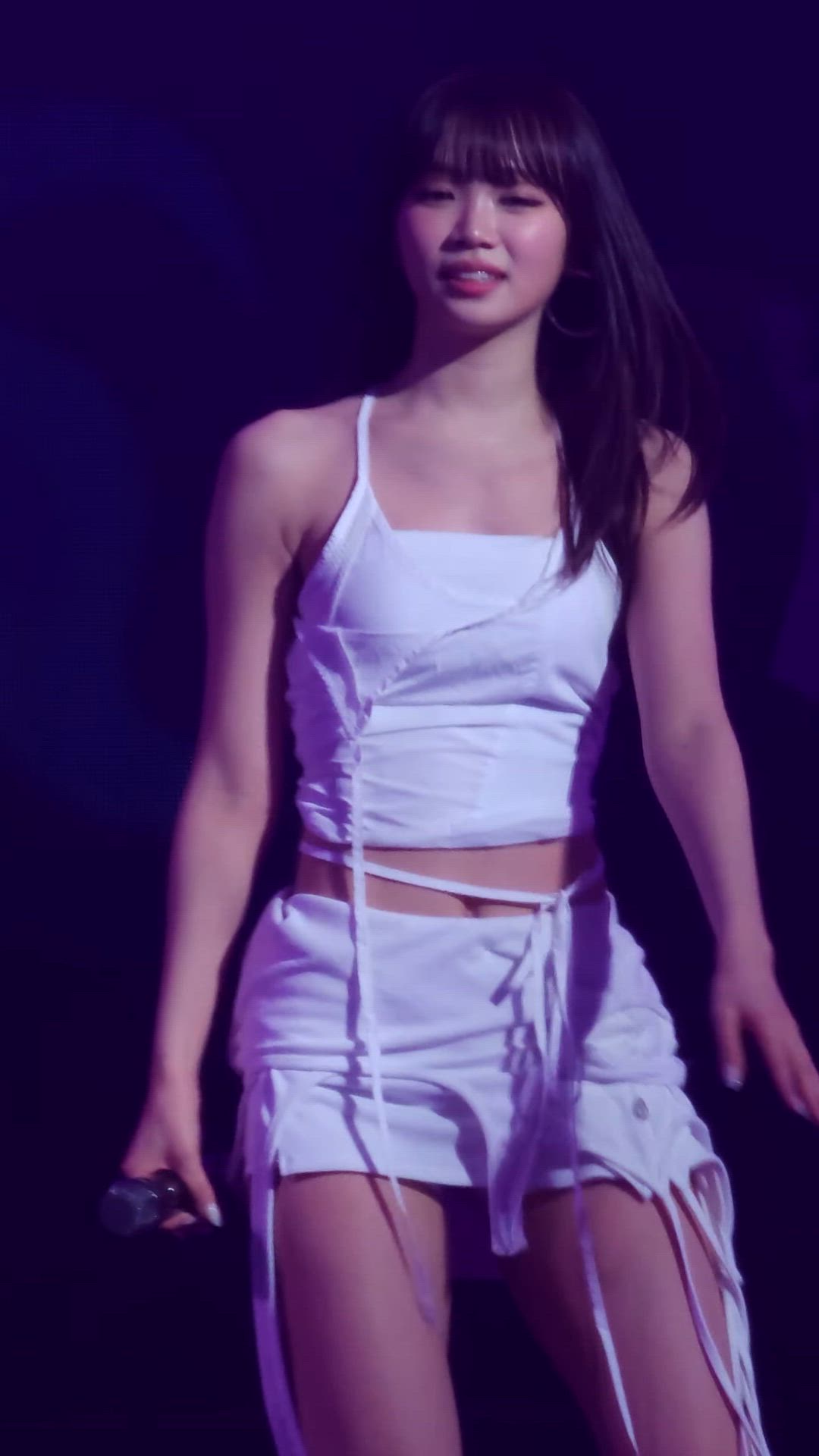 LE SSERAFIM's Chaewon presents a fashion-forward all-white look on stage. Her outfit features bold cut-outs and drawstring details, emphasizing Chaewon's active and hip style. The ensemble, consisting of a cropped top and a mini bottom, exudes youthful energy characteristic of K-pop idol aesthetics. This striking stage ensemble perfectly complements her powerful performance, adding captivating charm.