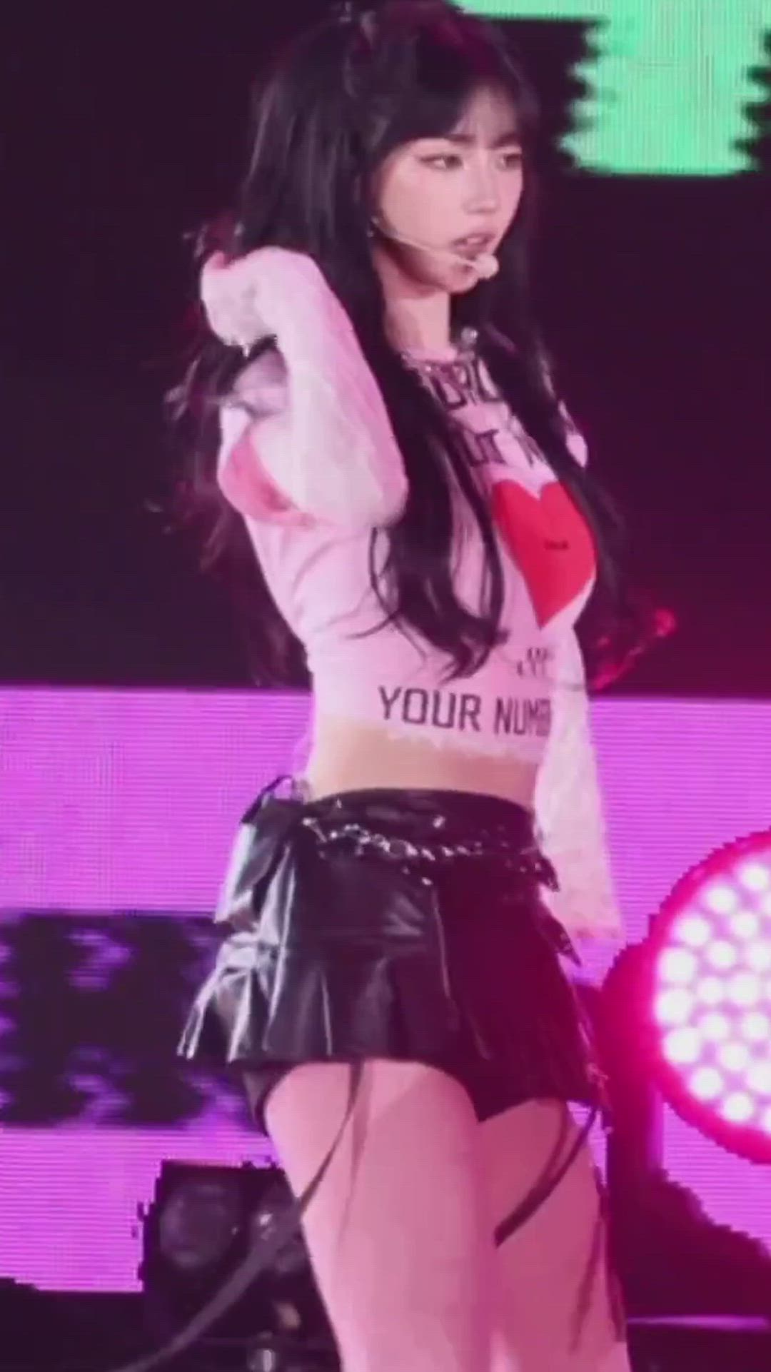 Karina는 무대에서 아이돌 무대 의상으로 힙하면서도 강렬한 스타일을 선보입니다. 밝은 컬러의 크롭탑과 블랙 레더 미니스커트를 매치하여 역동적인 매력을 강조하고 있습니다. 여기에 체인 액세서리와 가터 디테일을 더해 전체적으로 개성 있고 시크한 스트릿 패션 감각을 표현하고 있습니다. 활동적인 퍼포먼스에 최적화된 힙한 스타일을 연출합니다.