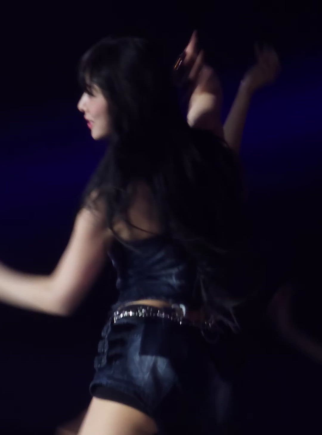 fromis_9's Chaeyoung is seen in a powerful Stage Outfit suitable for her dynamic performance. The overall dark-toned attire highlights Chaeyoung's charisma, embodying the essence of Idol Fashion. Both the top and bottom feature a tight fit, emphasizing Chaeyoung's energetic image, while accessories add a distinct Rock Chic vibe to her look.