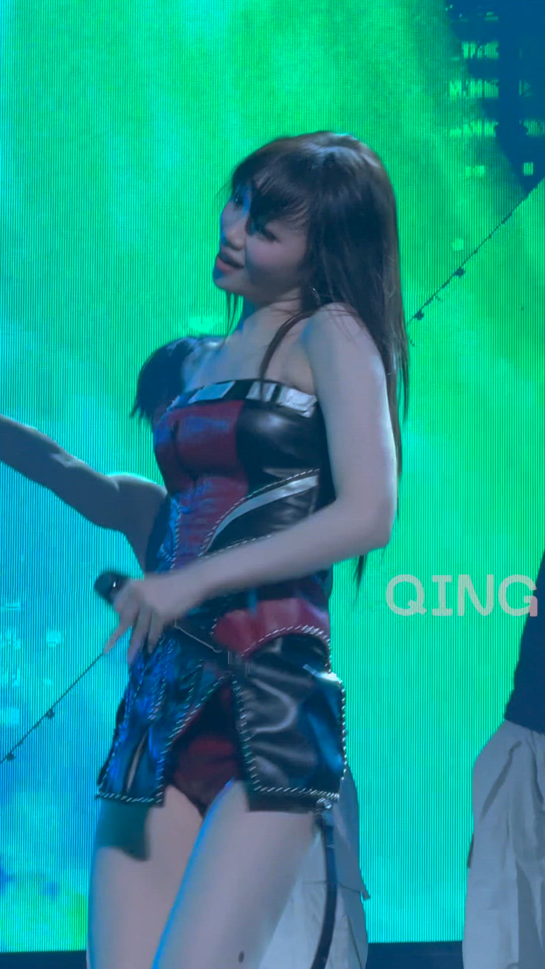Chaewon presents a fierce and edgy performance look. The striking combination of black and red in her corset-style top, paired with asymmetrical skirt details, creates a charismatic streetwear vibe. The overall tight fit and unique material blend further emphasize Chaewon's powerful stage presence.