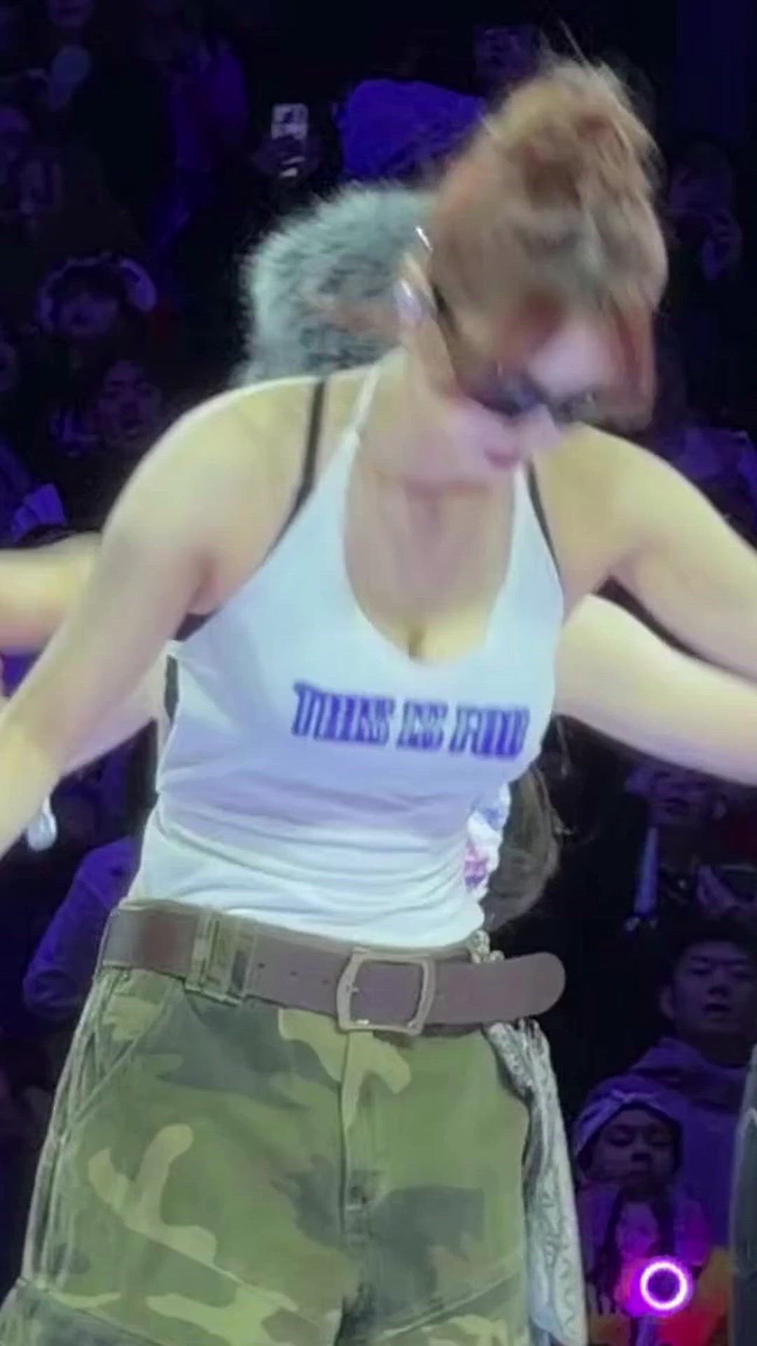 어두운 갈색 가죽 벨트를 착용하고 있습니다. 사각형 메탈 버클이 특징이며, 전체적인 스트릿웨어 룩에 견고한 느낌을 더합니다. 또한, 어두운 렌즈의 선글라스를 착용하여 시크한 분위기를 연출하고 있습니다. 머리는 높이 올려 묶은 번 헤어 스타일로, 활동적인 무대 의상과 잘 어울립니다. 벨트는 Massimo Dutti, 선글라스는 Gucci와 같은 브랜드에서 찾아볼 수 있습니다.