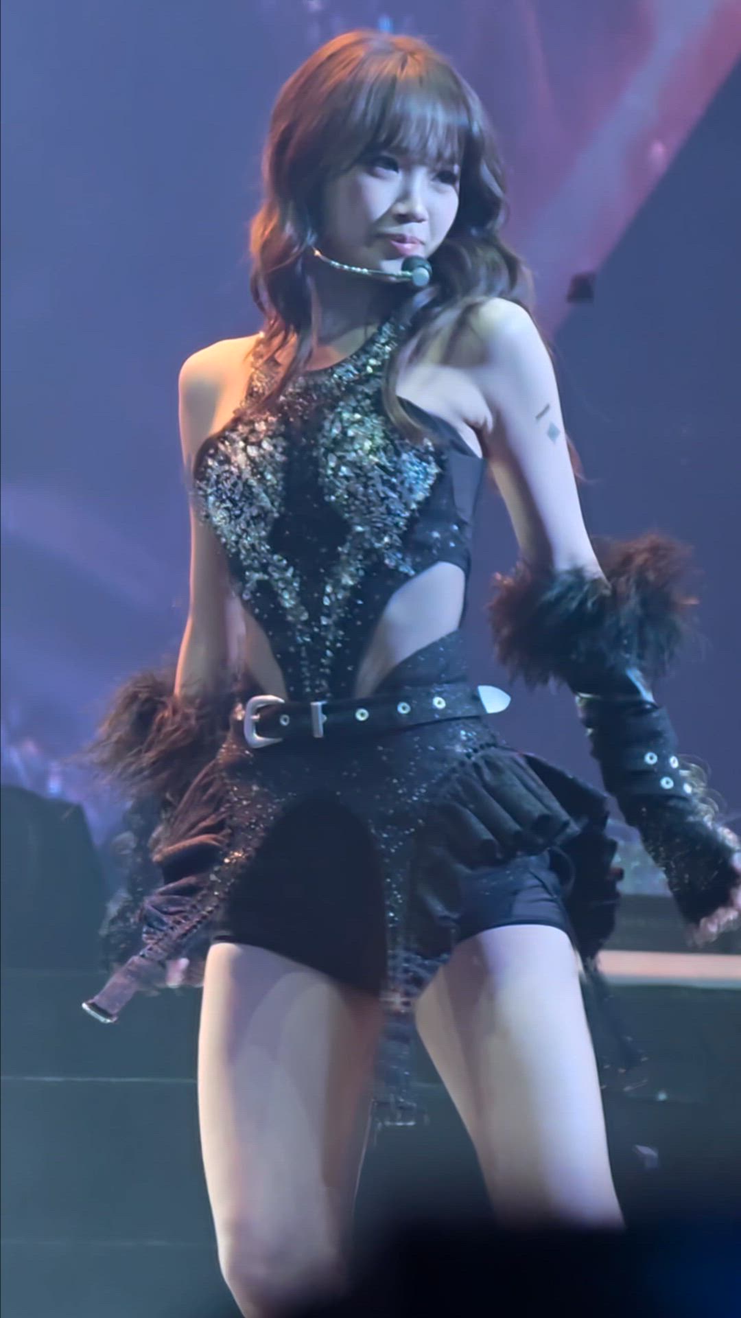LE SSERAFIM Chaewon은 무대 위에서 화려한 블랙 바디슈트 스타일을 선보입니다. 상체에 반짝이는 스팽글과 컷아웃 디테일이 돋보이며, 허리 벨트와 퍼 암 워머로 글래머러스한 분위기를 더합니다. 전체적으로 시크한 매력을 발산하며 퍼포먼스 의상으로서 강렬한 인상을 줍니다.