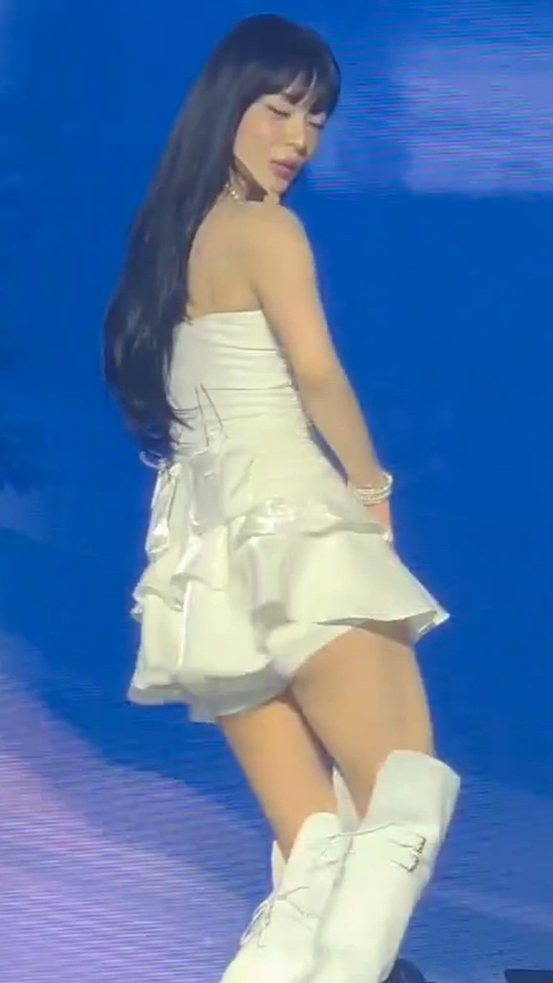 이채영은 무대 위에서 화려하면서도 사랑스러운 분위기를 연출하는 미니 드레스 스타일을 선보입니다. 무대 의상으로 적합한 화이트 컬러의 튜브톱 미니 드레스를 착용하여 밝고 경쾌한 에너지를 전달합니다. 드레스의 풍성한 러플 디테일과 함께 매치한 화이트 롱 부츠가 전체적인 룩에 통일감과 함께 아이돌 스타일의 세련된 감각을 더합니다. 이러한 스타일은 특별한 행사나 퍼포먼스에 잘 어울리는 패션 아이템 조합입니다.