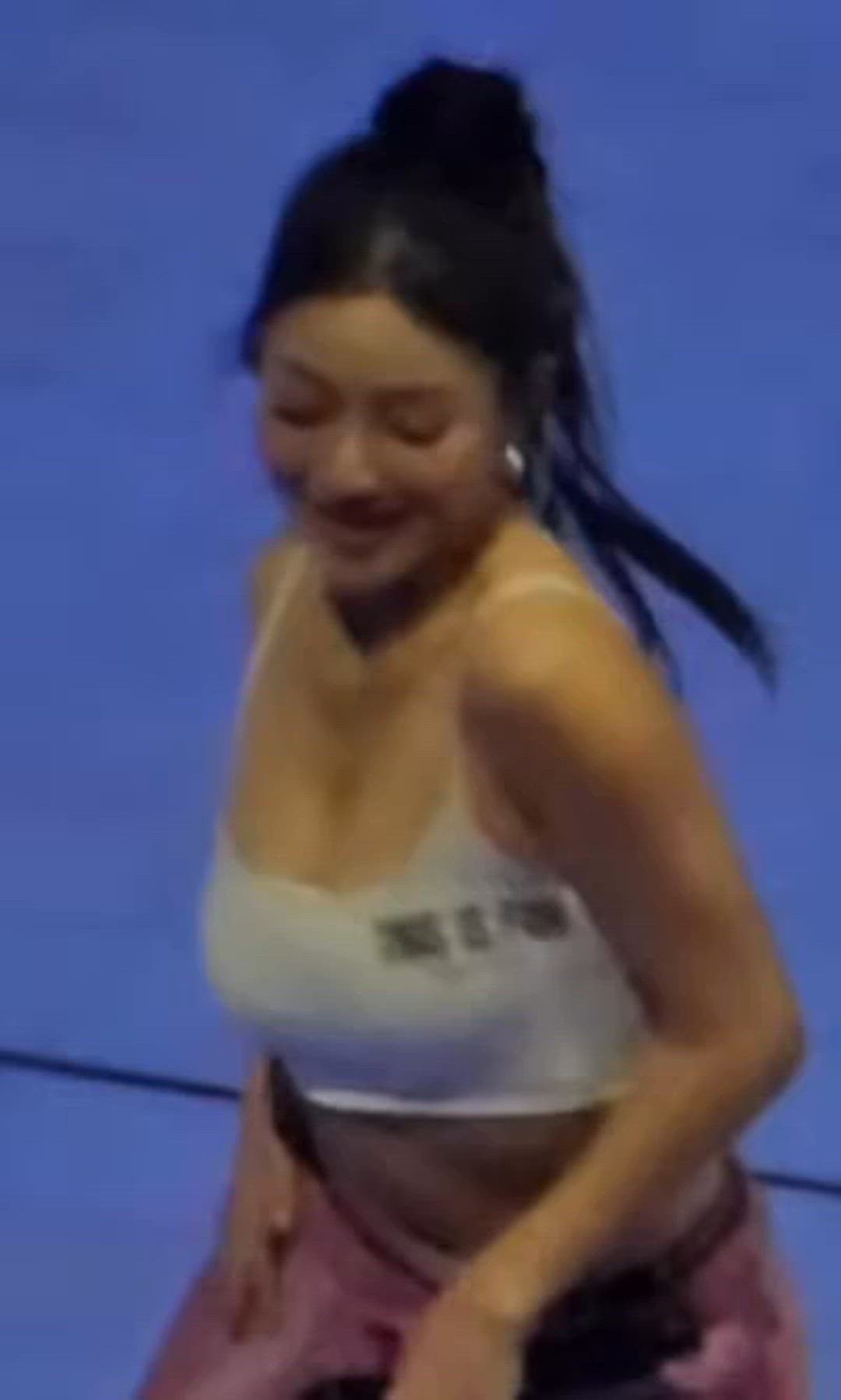 Jihyo showcases a casual yet active style on stage, utilizing performance wear. She pairs a white crop top with pink bottoms, creating a comfortable yet stylish atmosphere. This iconic style further highlights her vibrant charm and demonstrates a modern trendy fashion sense.