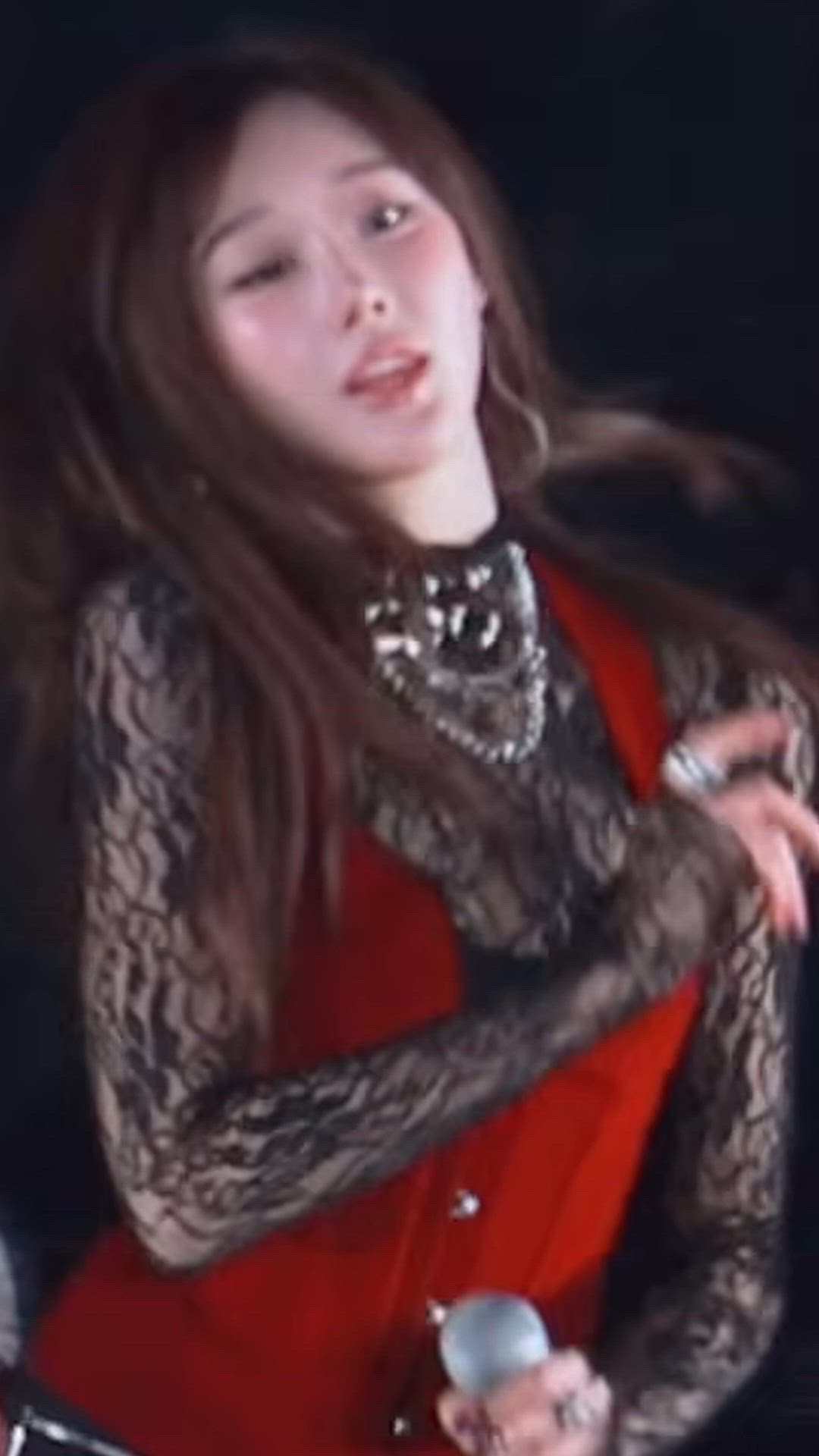 에스파 지젤은 시크하면서도 대담한 무대 의상을 선보입니다. 검은색 레이스 탑과 강렬한 빨간색 베스트를 레이어드하여 레이어드 스타일을 연출했습니다. 화려한 스테이트먼트 주얼리가 더해져 전체적으로 럭셔리 패션 분위기를 강조합니다.