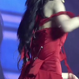 Chaeyoung presents a captivating stage outfit with a mesmerizing red dress, drawing immediate attention. The intense vibrancy of the red color combined with the dress's elegant silhouette creates a sophisticated luxury style aesthetic. The off-shoulder design and short-length skirt further enhance her active yet feminine charm.