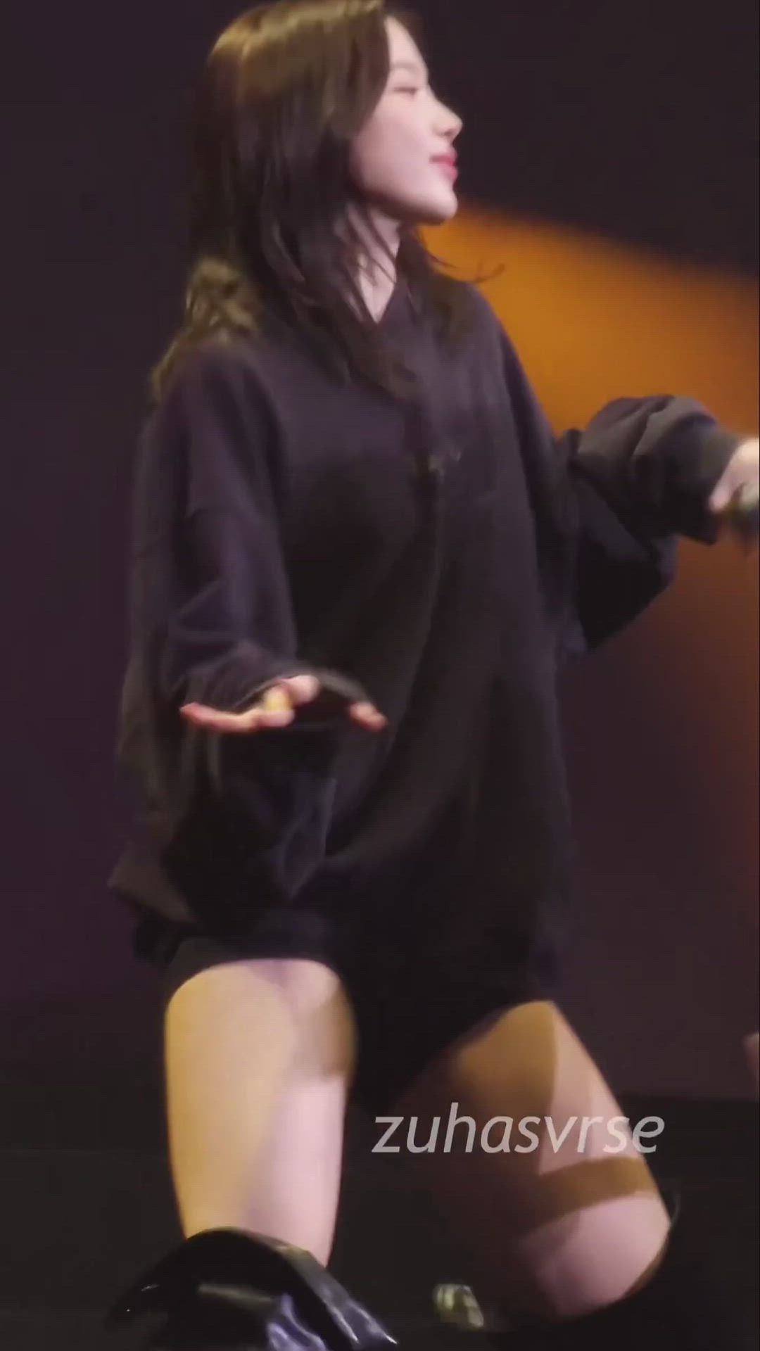 르세라핌 카즈하는 무대 위에서 편안하면서도 스타일리시한 무드의 의상을 선보입니다. 넉넉한 오버사이즈 스웨트셔츠와 짧은 하의, 그리고 광택감 있는 롱부츠를 매치하여 활동적이면서도 시크한 분위기를 연출하고 있습니다. 전체적으로 블랙 컬러를 활용하여 모던하고 감각적인 스트릿 스타일을 완성했습니다. 카즈하의 자연스러운 매력이 돋보이는 룩입니다.