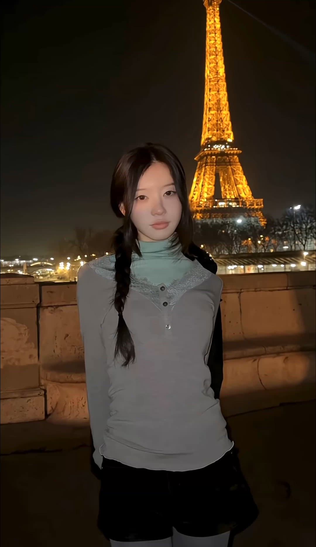 ILLIT's Moka presents a comfortable yet sophisticated fashion style against the backdrop of a Parisian night. She showcases the essence of a layered style by wearing a mint-colored turtleneck under a grey Henley T-shirt, with lace detailing on the top adding a feminine charm. The overall muted color palette creates a chic casual look, and her naturally braided hair emphasizes a romantic vibe. It is an attractive coordination that is both urban and comfortable, reflecting a unique design approach.