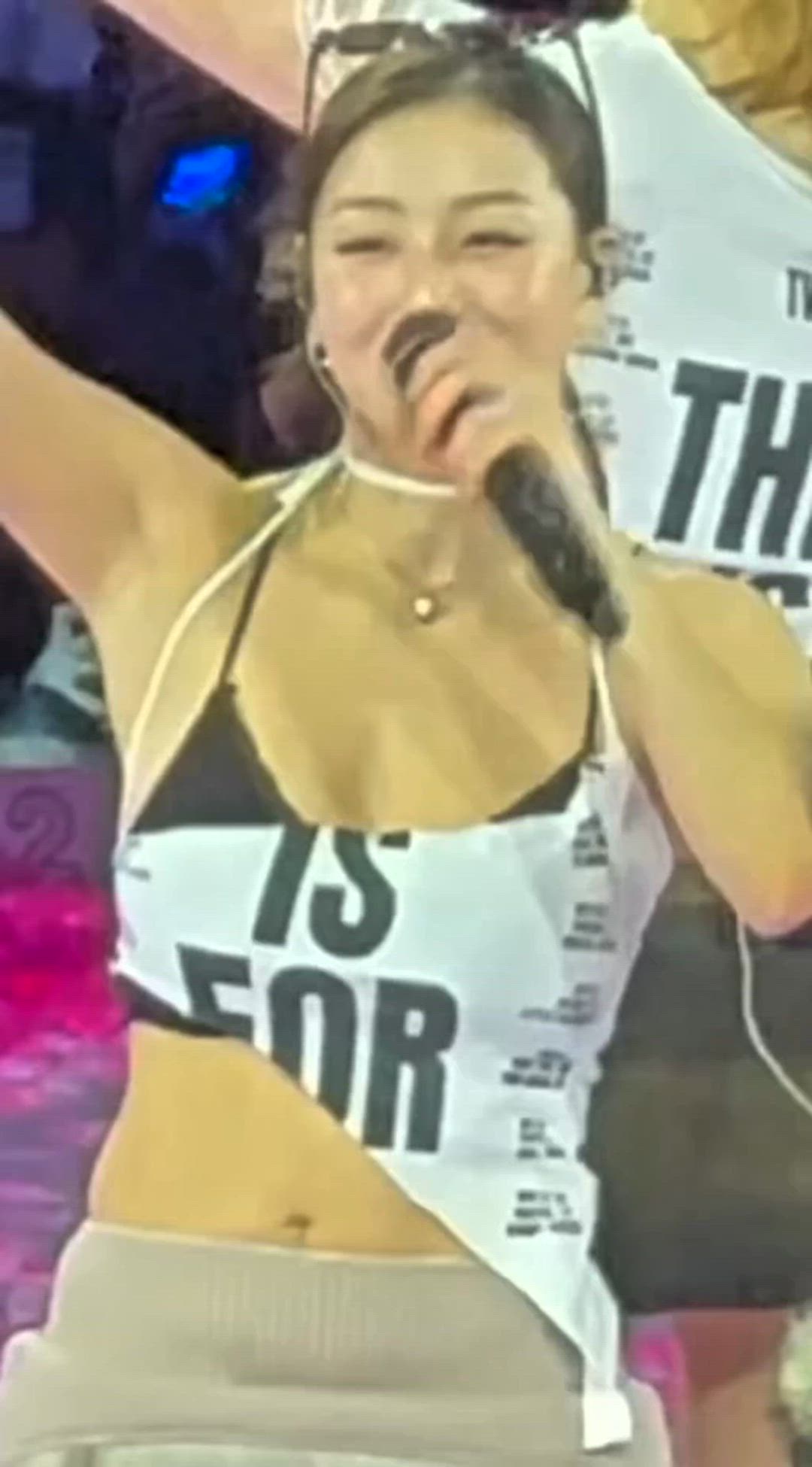 Jihyo showcases an active yet stylish performance attire. She presents a comfortable yet trendy K-pop star fashion overall, with a striking combination of a cool top and comfortable bottoms. Her distinctive cropped top styling particularly draws attention.