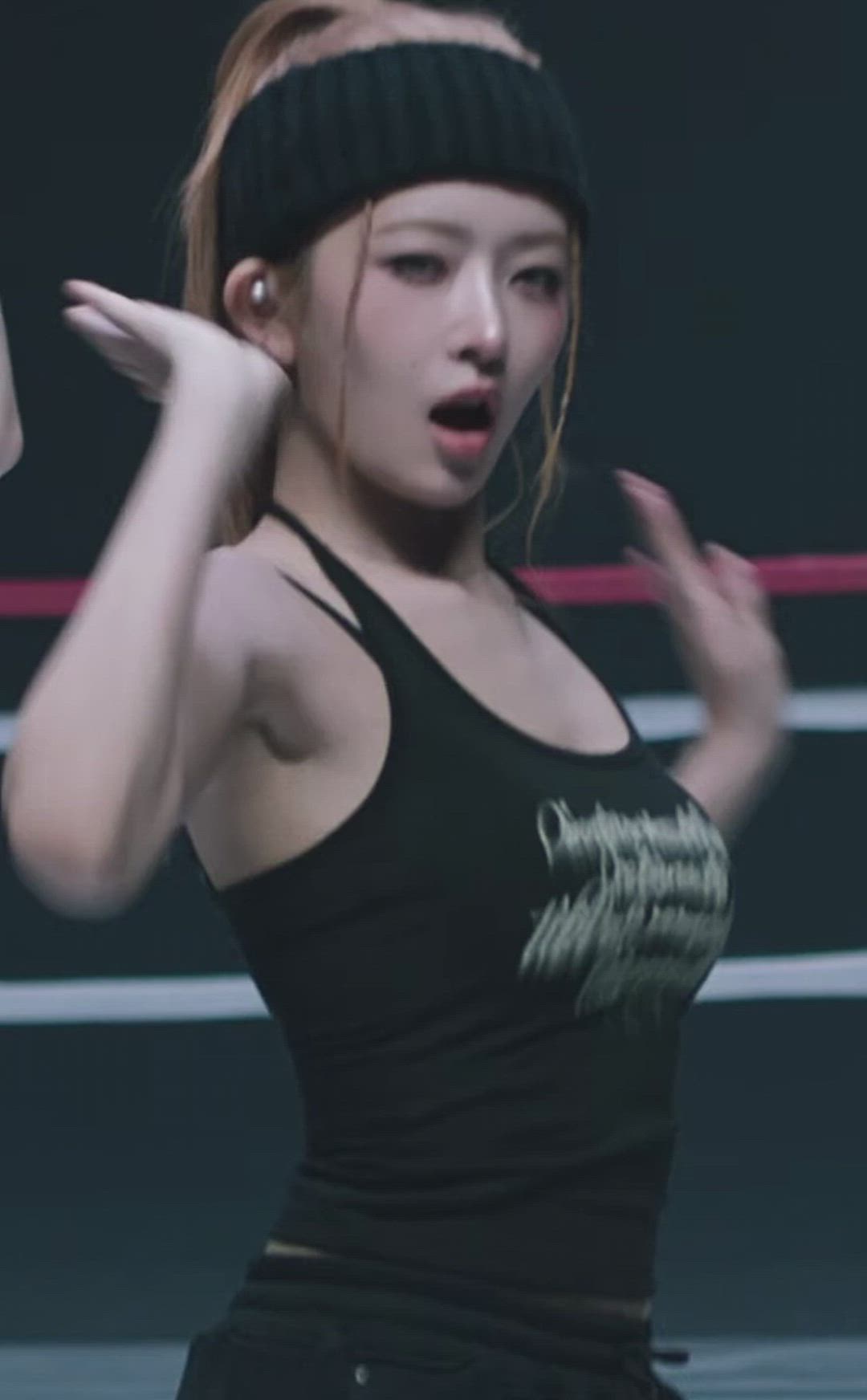 IVE의 레이는 트렌디한 스트릿웨어 분위기를 연출하는 활동적인 스타일을 선보입니다. 블랙 컬러의 상의와 하의를 매치하여 시크하면서도 편안한 힙한 스타일링을 완성했습니다. 특히, 로고 디테일이 돋보이는 상의와 니트 헤어밴드는 전체적인 룩에 쿨한 무드를 더해주며, 무대 위에서의 에너지 넘치는 퍼포먼스에 적합한 의상입니다. 레이는 이러한 아이템들을 통해 자신감 있고 역동적인 매력을 발산하고 있습니다.