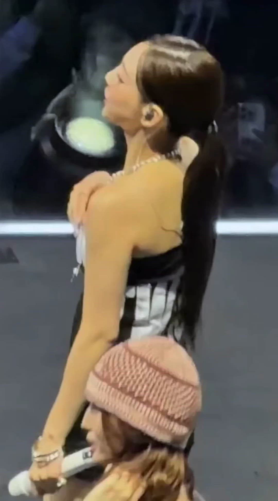 The sleeveless top features a prominent black and white stripe or graphic pattern. It has a slim fit that accentuates Nayeon's silhouette and appears to be made from a performance-oriented fabric, suitable for a dynamic concert attire. This style of top is similar to the edgy designs offered by brands like Balmain or Off-White.