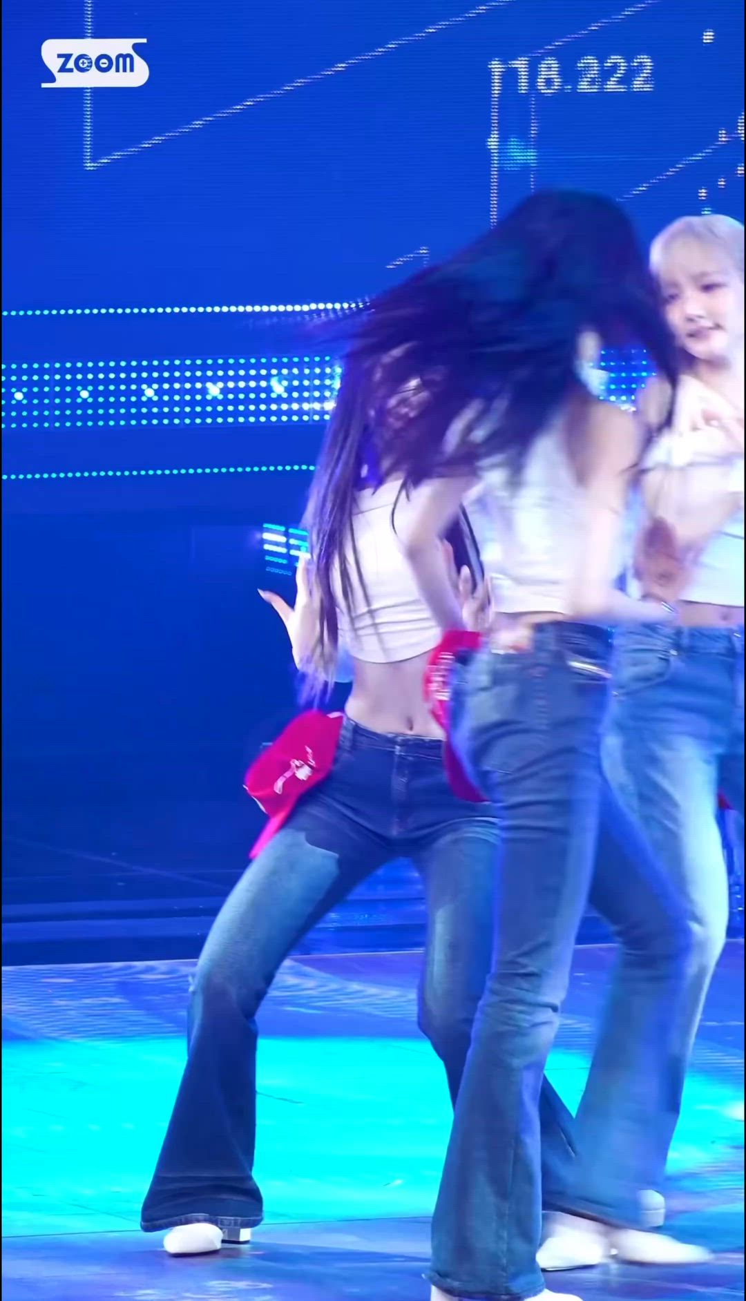 SUI presents a casual yet vibrant stage fashion style. She pairs a white cropped top with mid-wash bootcut jeans, emphasizing a comfortable yet sophisticated feel. A red bandana tied around her waist adds a lively accent to the overall look, expressing a youthful and trendy sensibility.