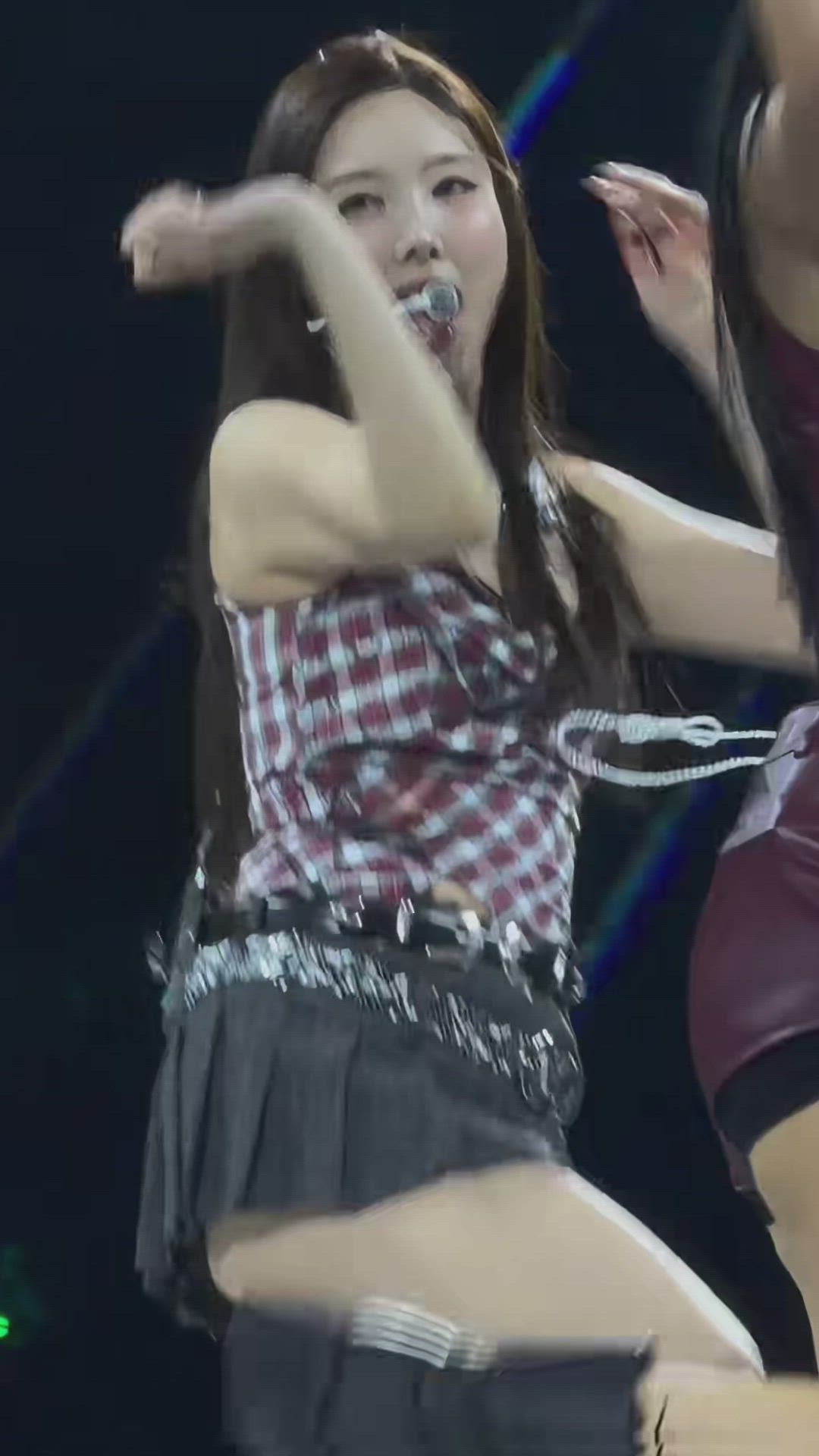 나연은 붉은색과 흰색 체크 패턴의 크롭탑과 블랙 플리츠 미니 스커트를 매치하여 아이돌 무대 의상으로 활기찬 모습을 보여줍니다. 스커트 허리 부분에는 실버 장식이 더해져 펑키하면서도 패셔너블한 스타일링을 완성하고 있습니다. 전체적으로 활동적이면서도 개성 넘치는 유니크한 디자인이 돋보이는 무대룩입니다.