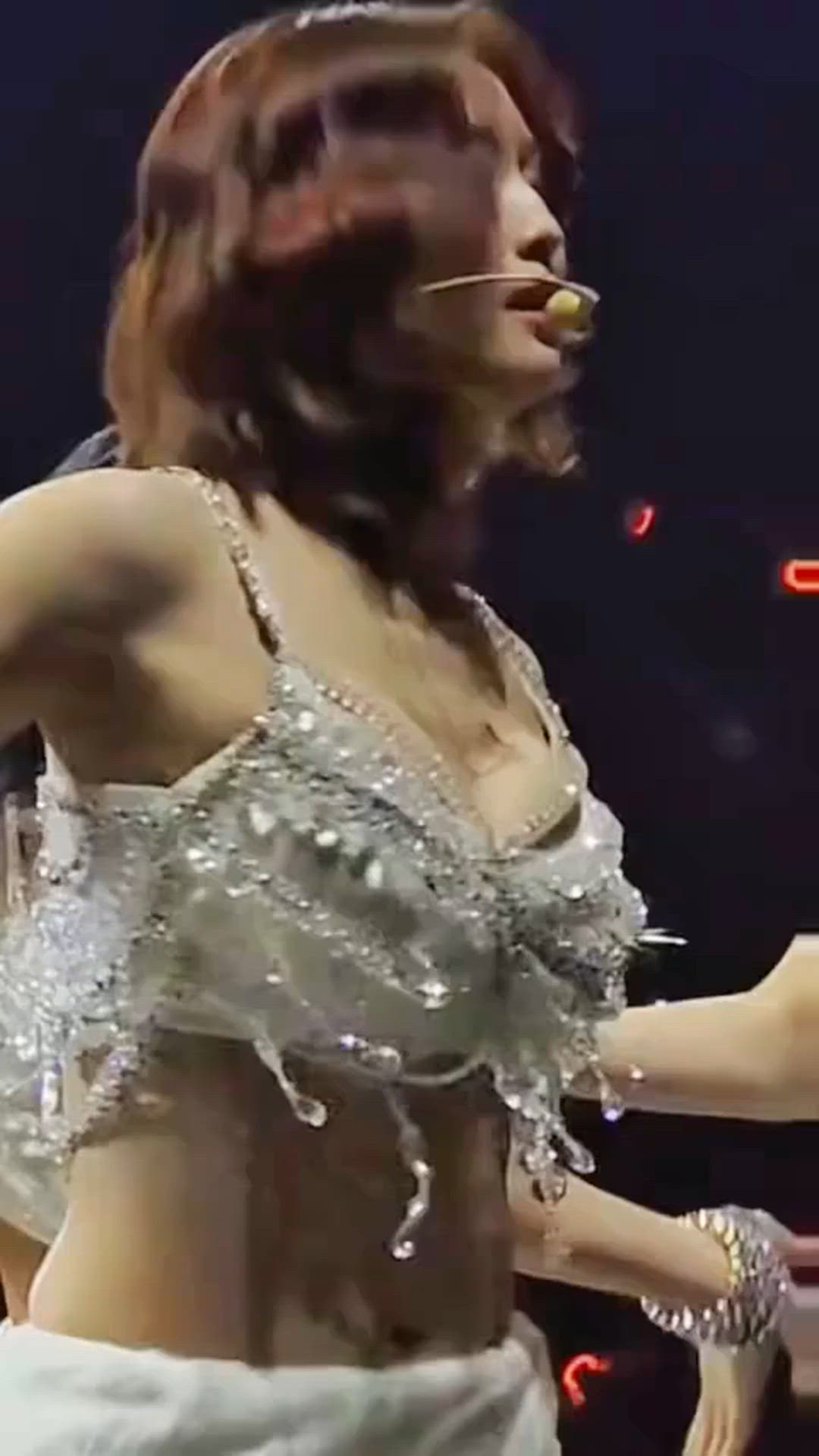 In the picture, Momo presents a glamorous and shimmering stage outfit style, pairing a sparkling top with simple bottoms. The top is a cropped design adorned with delicate beads and sequins, radiating an even brighter charm under the lights. Overall, this look features distinctive details, creating an upscale presentation that further highlights Momo's performance.