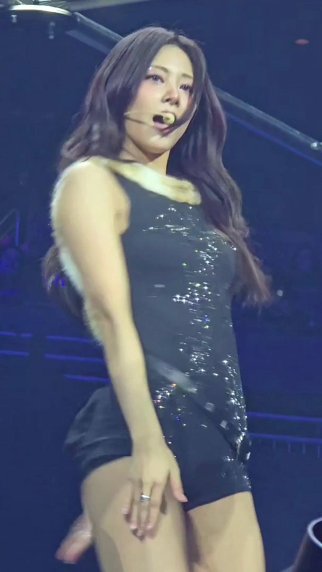 쯔위는 무대 위에서 시선을 사로잡는 무대의상을 선보입니다. 상의는 블랙 컬러의 민소매 디자인으로, 상체 전면에 반짝이는 글리터 장식이 돋보입니다. 목 부분에는 부드러운 느낌의 퍼트림 디테일이 더해져 고급스러운 분위기를 연출합니다. 하의는 상의와 같은 블랙 컬러의 쇼츠로, 전체적으로 활동적이면서도 화려한 아이돌의 매력을 강조합니다.