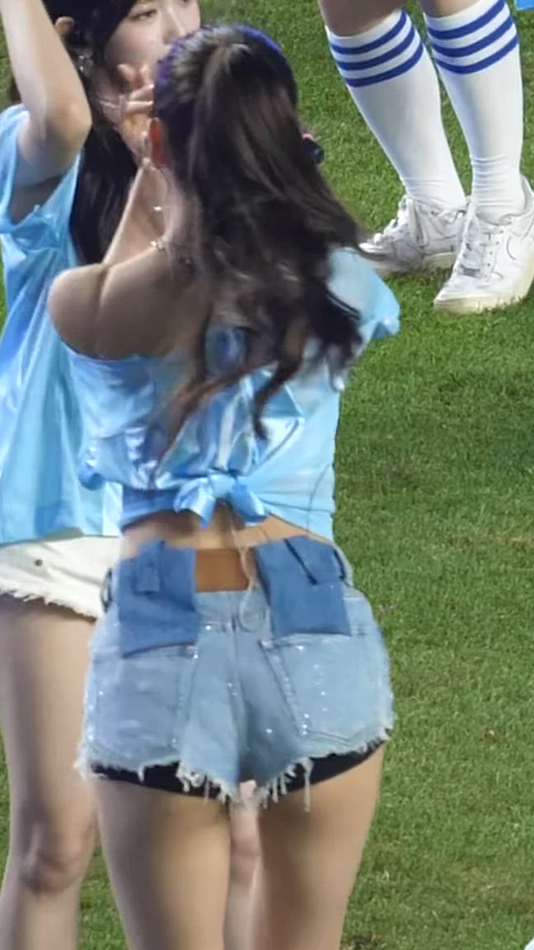 IVE의 유진은 밝은 스카이블루 컬러의 크롭탑과 데님 쇼츠를 매치하여 활동적이면서도 스타일리시한 여름 패션을 선보이고 있습니다. 상의는 가벼운 소재로 제작되어 시원한 느낌을 주며, 허리 부분의 묶음 디테일이 경쾌한 분위기를 더합니다. 하의는 워싱 처리된 데님 소재의 숏 팬츠로, 밑단이 헤지고 반짝이는 디테일이 더해져 개성을 강조합니다. 전반적으로 편안하면서도 트렌디한 데님 쇼츠 스타일링으로, 무대 의상이나 캐주얼한 야외 활동에 잘 어울리는 코디입니다.