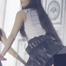 하의는 광택감 있는 블랙 미니 스커트를 착용했습니다. 허리 부분에는 반짝이는 스톤이나 스터드 장식이 돋보이며, 스커트 자체는 플레어 또는 A라인 실루엣으로 활동적인 스테이지룩에 잘 어울립니다. 이러한 디자인은 Givenchy나 Philipp Plein과 같은 브랜드의 아이템에서 찾아볼 수 있는 트렌디한 디테일입니다.