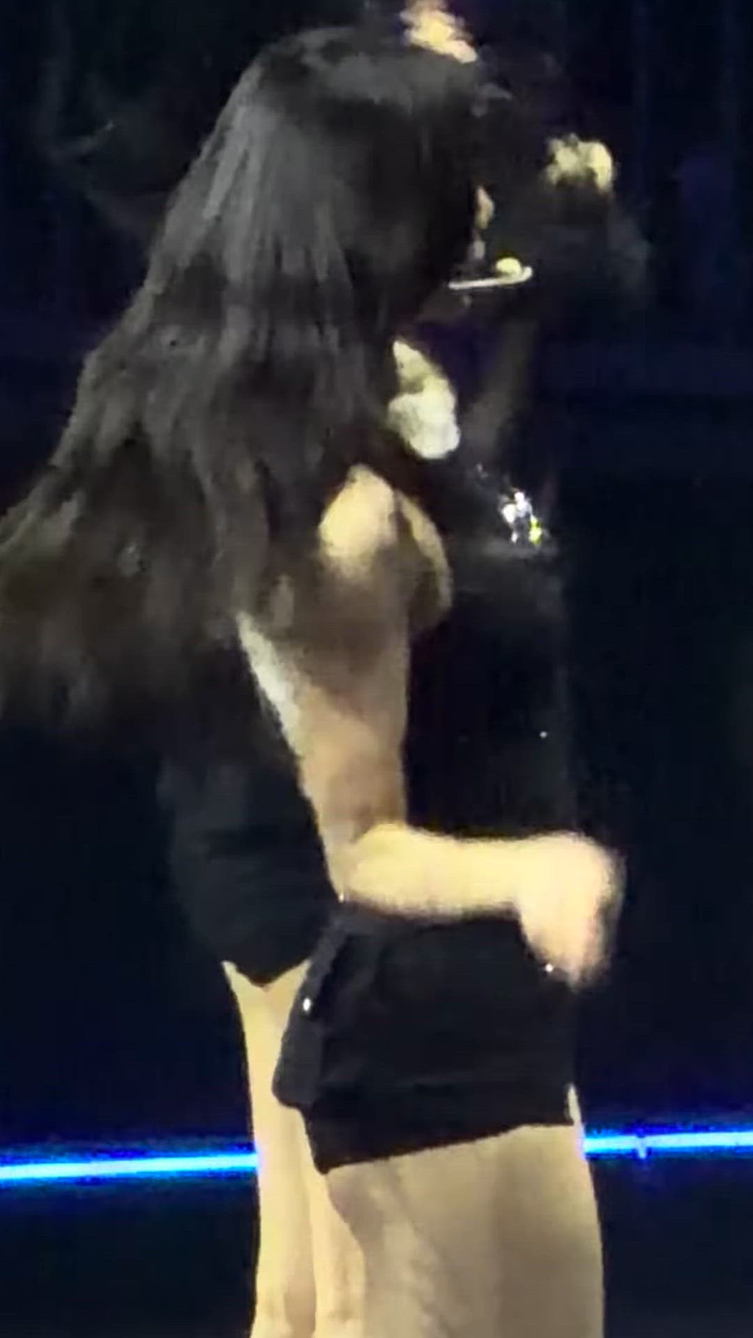 TWICE - Tzuyu presents a powerful performance look on stage, exuding intense charisma. She pairs a black sleeveless top with matching shorts, creating a chic yet dynamic ensemble. The top features sparkling details, emphasizing a glamorous appeal, and the overall slim, fitted design highlights Tzuyu's beautiful silhouette. These glitter embellishments shine even brighter under the lights, serving as a captivating focal point.