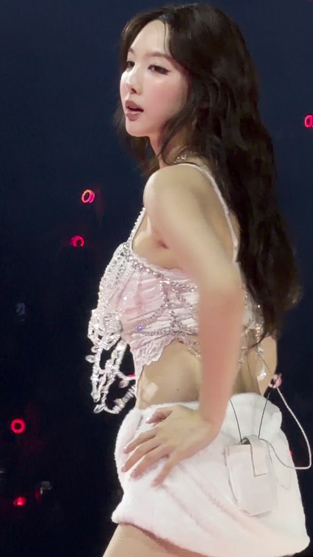 나연은 반짝이는 디테일과 부드러운 소재가 조화를 이루는 무대 의상을 선보입니다. 핑크색 크롭 상의는 화려한 비즈 장식으로 시선을 사로잡으며, 흰색 퍼 미니 스커트와 어우러져 사랑스러우면서도 화려한 매력을 강조합니다. 전체적으로 세련된 무대 패션으로, 나연의 발랄한 이미지를 부각하고 있습니다.