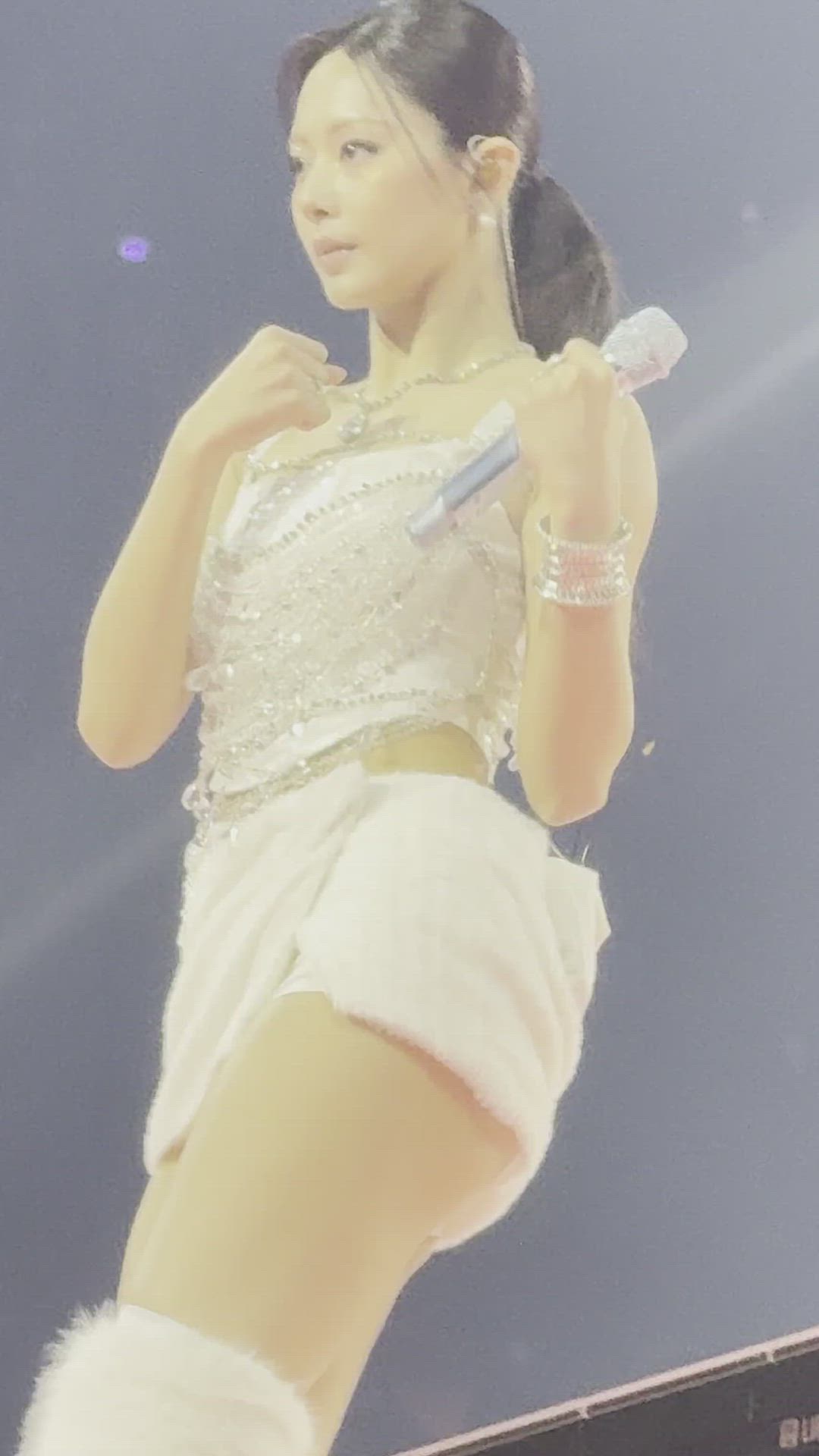 TWICE 쯔위는 무대 위에서 눈부신 아이돌 무대 의상을 선보이고 있습니다. 전체적으로 화이트 톤의 의상에 화려한 비즈 장식이 더해져 럭셔리한 분위기를 연출합니다. 상의는 반짝이는 디테일로 시선을 사로잡으며, 하의는 부드러운 소재의 랩 스커트 디자인으로 우아함과 동시에 활동성을 강조합니다. 쯔위는 이 스타일을 통해 그녀만의 세련되고 매혹적인 매력을 발산하고 있습니다.