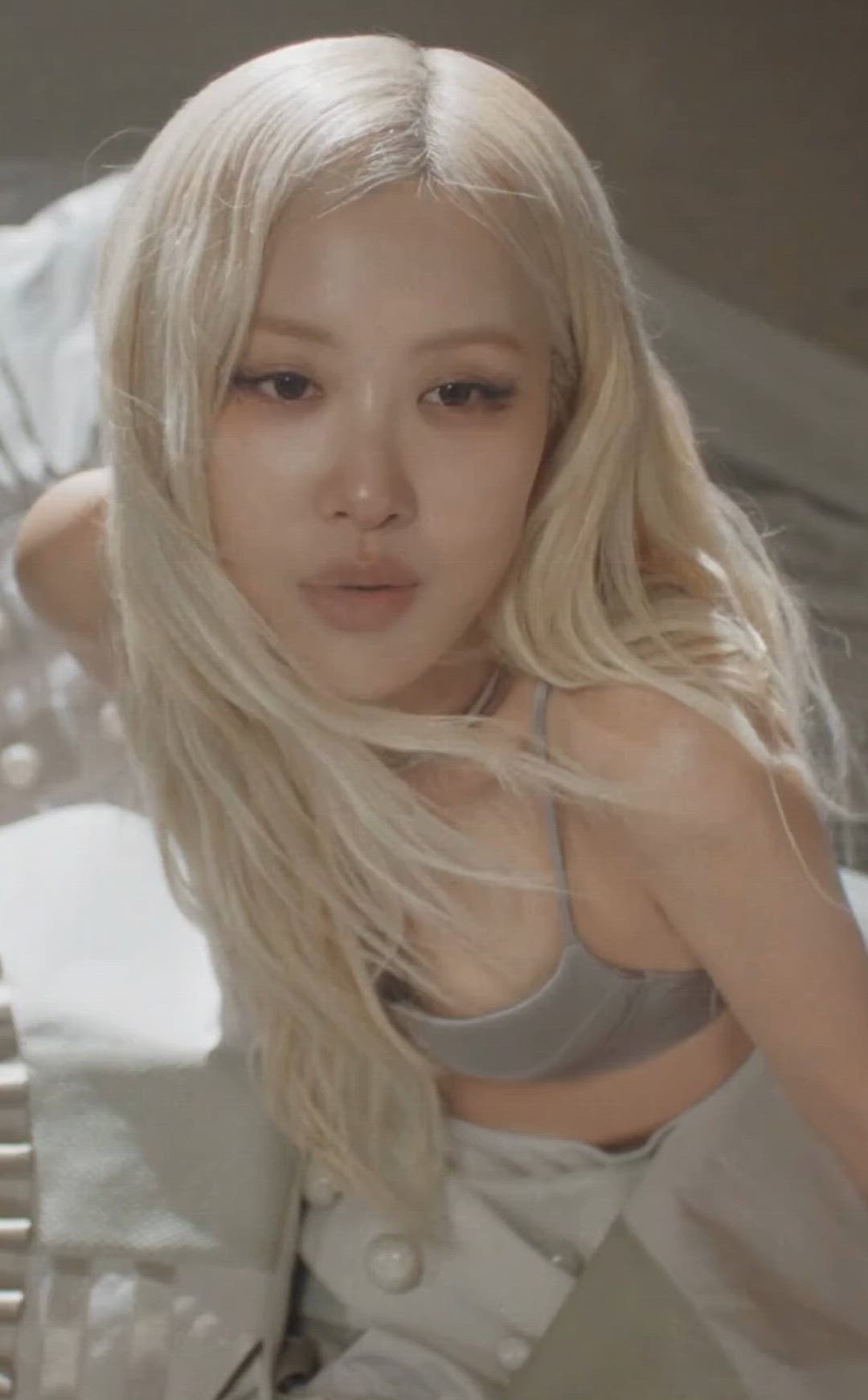 로제는 연한 그레이 컬러의 브라톱을 착용하고 있습니다. 얇은 어깨 스트랩과 부드러운 소재감이 돋보이며, 몸에 자연스럽게 밀착되는 핏으로 편안하면서도 여성스러운 실루엣을 연출합니다. 이와 유사한 스타일은 캘빈클라인이나 인티미시미와 같은 브랜드에서 찾아볼 수 있습니다.