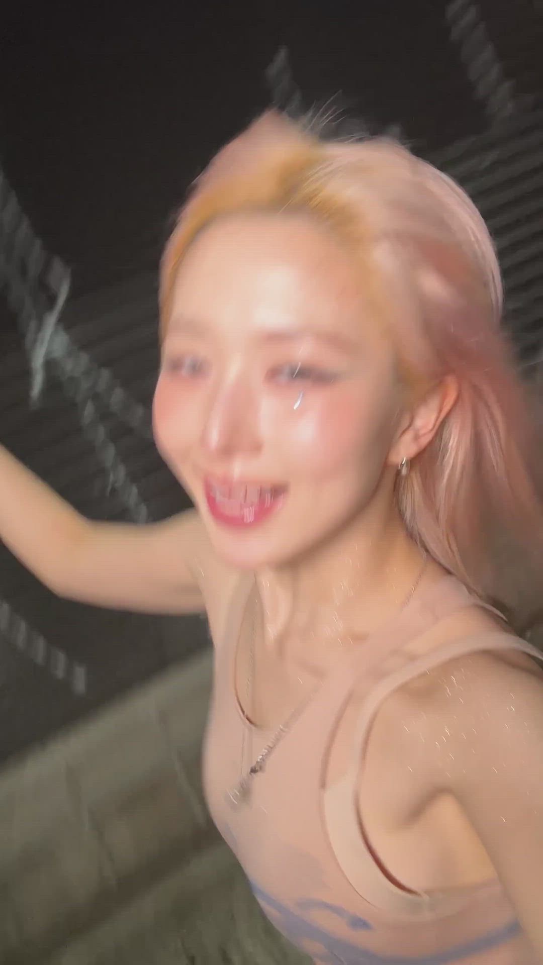 밝은 누드톤 또는 페일 핑크 컬러의 슬리브리스 탑을 착용하고 있습니다. 몸에 밀착되는 바디콘 핏으로, 신축성 있는 소재로 보입니다. 어깨 스트랩이 넓게 디자인되어 안정감을 주며, 전체적으로 매끄럽고 심플한 실루엣이 특징입니다. 물에 젖은 듯한 연출과 어우러져 더욱 시선을 사로잡는 스킨톤 의상입니다. 이러한 스타일은 Prada나 Celine과 같은 브랜드에서 볼 수 있는 미니멀하고 고급스러운 디자인과 유사합니다.