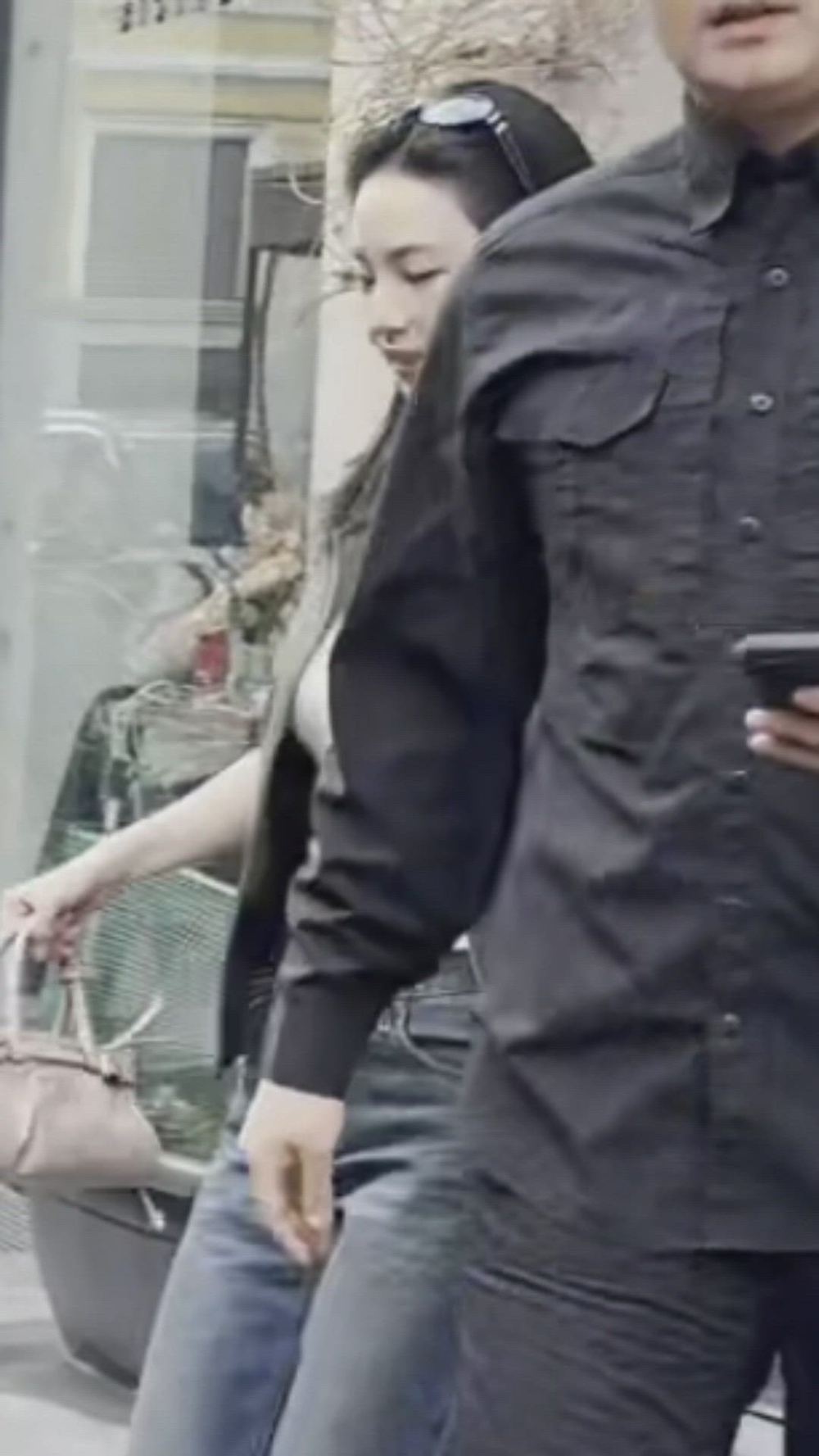 Karina is wearing a lightweight black jacket. This jacket is made from a thin material, suitable for transitional weather, and features banded cuffs and hem, giving it a casual yet active feel. Underneath, she has paired a white slim-fit inner top, creating a clean and refreshing look. This top combination can be found in minimalist yet sophisticated casual items from brands like Prada or Celine.