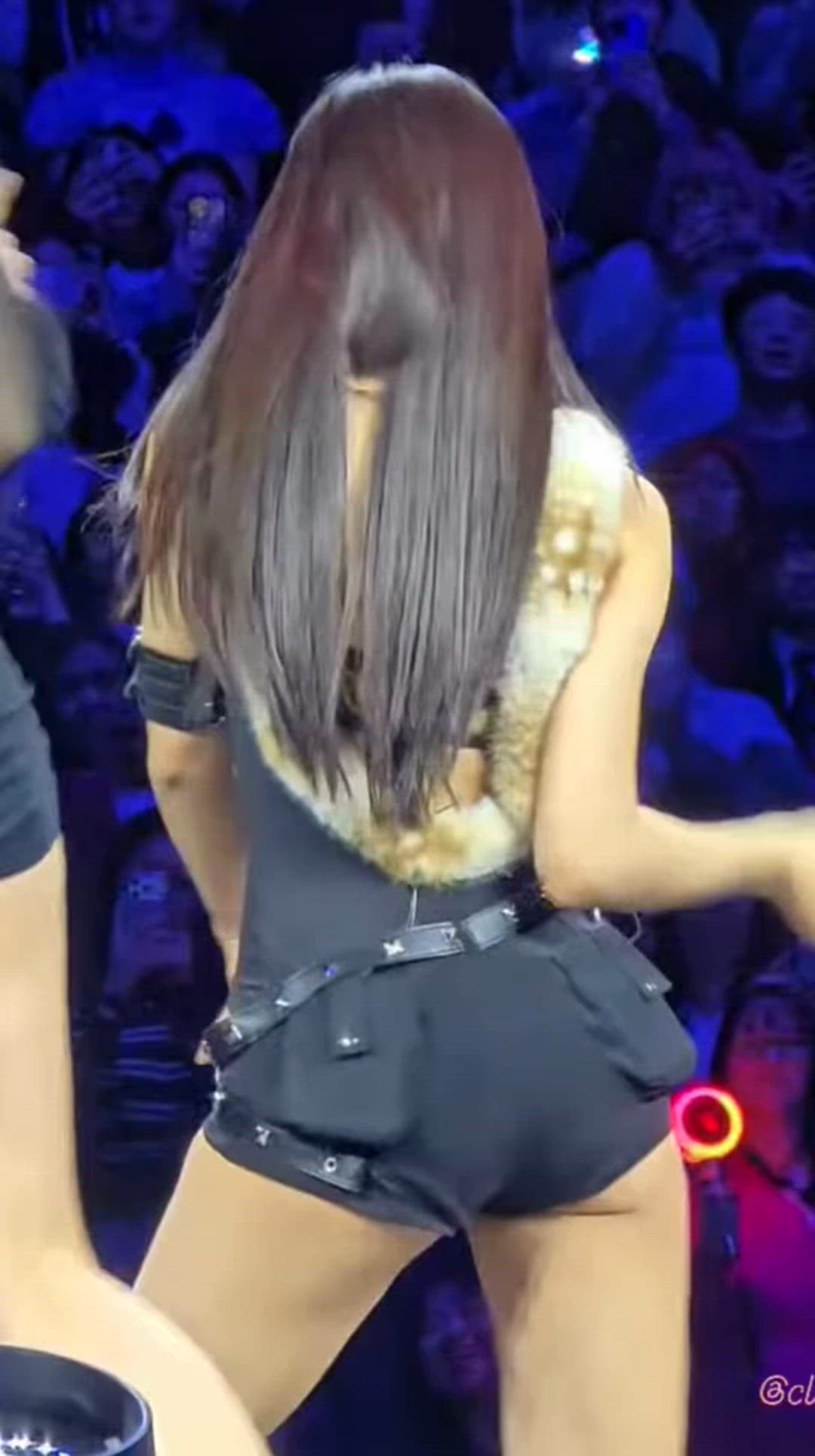 TWICE 쯔위는 무대 위에서 퍼 디테일이 돋보이는 강렬하고 엣지 있는 스테이지 의상을 선보였습니다. 전체적으로 블랙 컬러의 바디수트와 쇼츠가 결합된 듯한 디자인에 풍성한 퍼 장식이 더해져 화려하면서도 시크한 분위기를 연출합니다. 특히 하의 부분에는 여러 개의 스트랩 장식과 메탈릭한 하드웨어가 더해져 록 시크 무드를 강조하며, 활동적인 퍼포먼스에 적합한 스타일입니다. 쯔위는 이러한 의상으로 카리스마 넘치는 매력을 발산합니다.