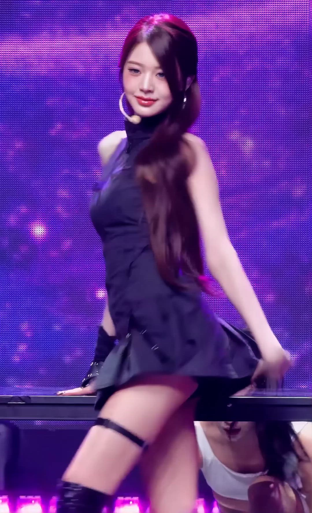 Wonyoung showcases a powerful presence on stage, perfectly pulling off a performance look. She creates an iconic style with dark-toned attire and bold accessory pairings. The overall outfit exudes a chic yet rock-chic vibe, presenting a high-end fashion statement that emphasizes her captivating charisma.