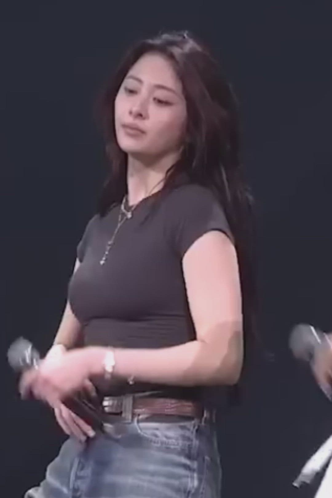 LE SSERAFIM's Yunjin presents a comfortable yet stylish daily wear look. She pairs a fitted black crop T-shirt with washed denim jeans, emphasizing a hip yet minimalist fashion sensibility. Accentuated with a silver long necklace, a belt, and a watch, her outfit exudes a casual chic streetwear vibe. The naturally flowing hairstyle complements the overall look, creating an effortlessly stylish appearance that is both understated and captivating.