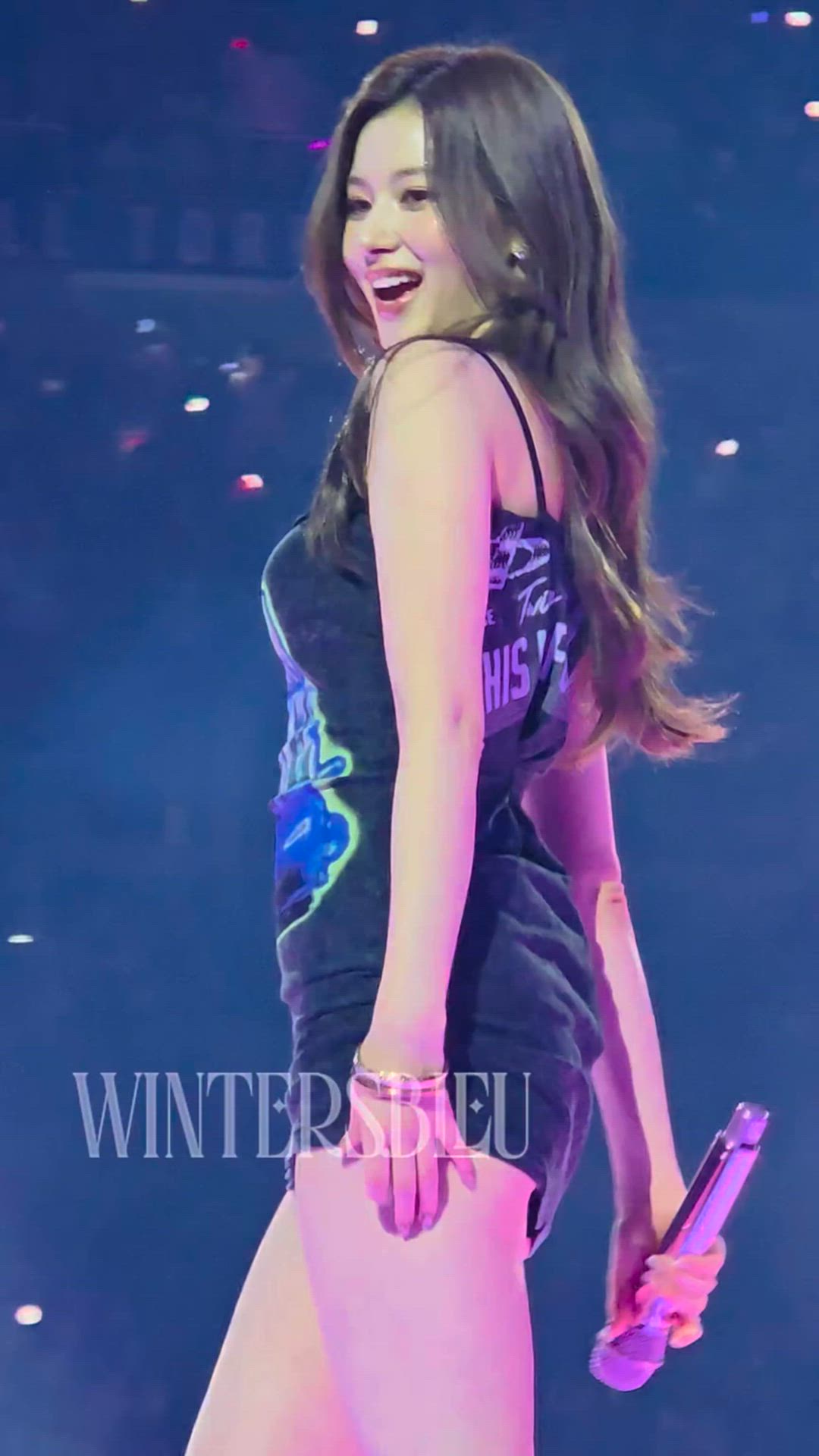 She is wearing dark-toned short shorts. The short length highlights her leg line, giving an active impression, and the comfortable fit seems suitable for stage performances. The material is presumed to be cotton or a denim blend. Shorts of this design can be found at brands like Levi's, Diesel, or Guess.