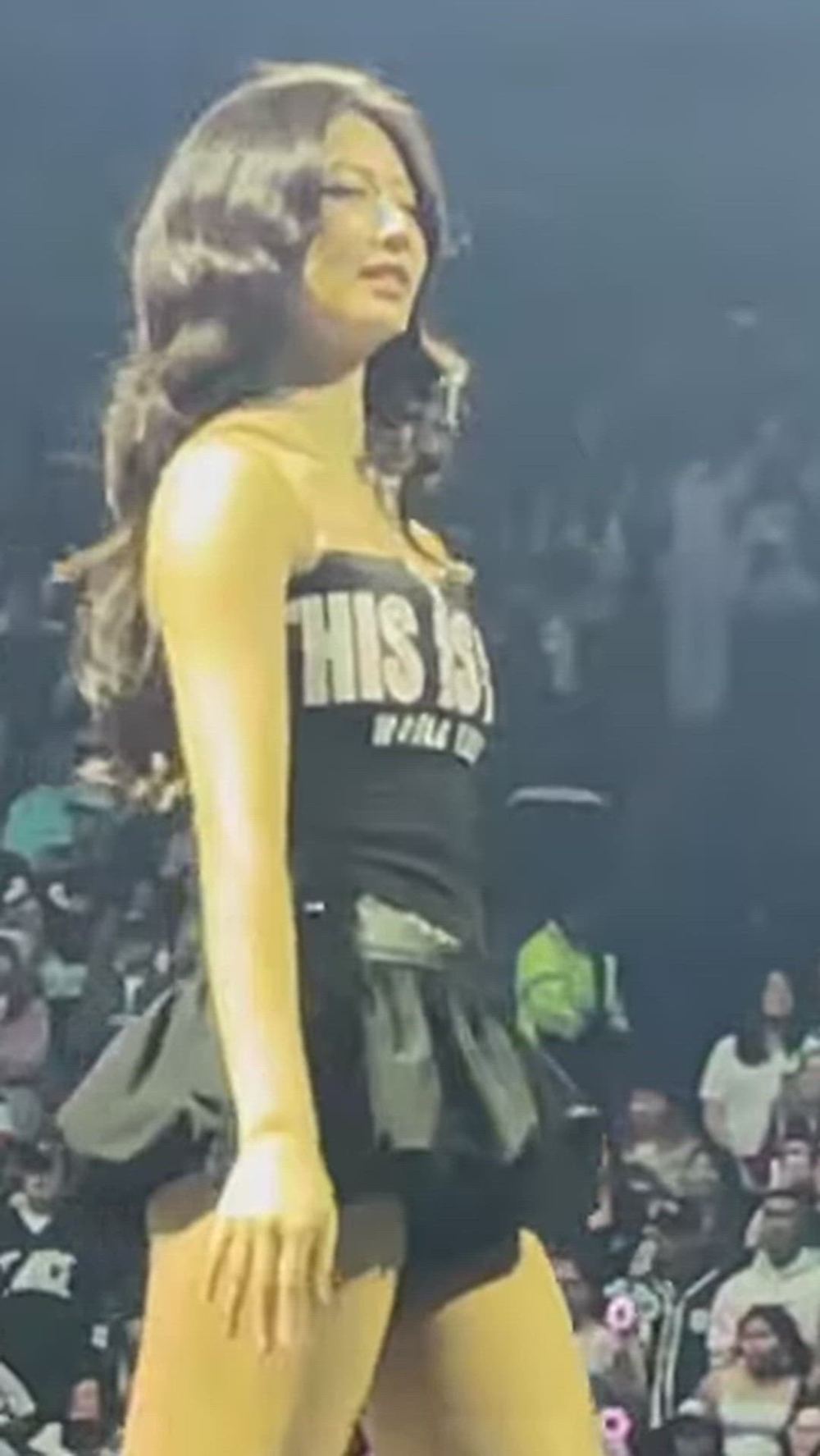 TWICE's Tzuyu presents a chic yet lively charm on stage. Tzuyu styled a strapless top with a voluminous mini skirt, creating a trendy stage outfit. The overall black color scheme provides a cohesive look, while the lettering detail on the top and the unique silhouette of the bottom add distinct points. This styling emphasizes Tzuyu's sophisticated image and is suitable for dynamic performances.