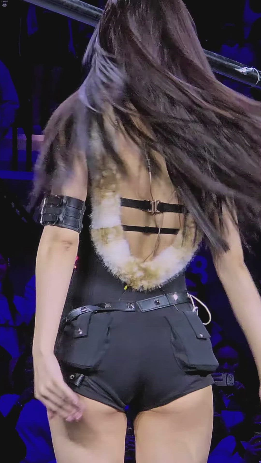TWICE Tzuyu presents a bold and intense performance wear on stage. She combines a black bodysuit with rich glamorous faux fur details and utility elements, creating a unique yet sophisticated avant-garde fashion style. The body-hugging silhouette accentuates Tzuyu's slender figure, while the fur embellishments and leather accessories contribute to a charismatic aura. Overall, this outfit is optimally designed for an edgy and powerful stage presence.