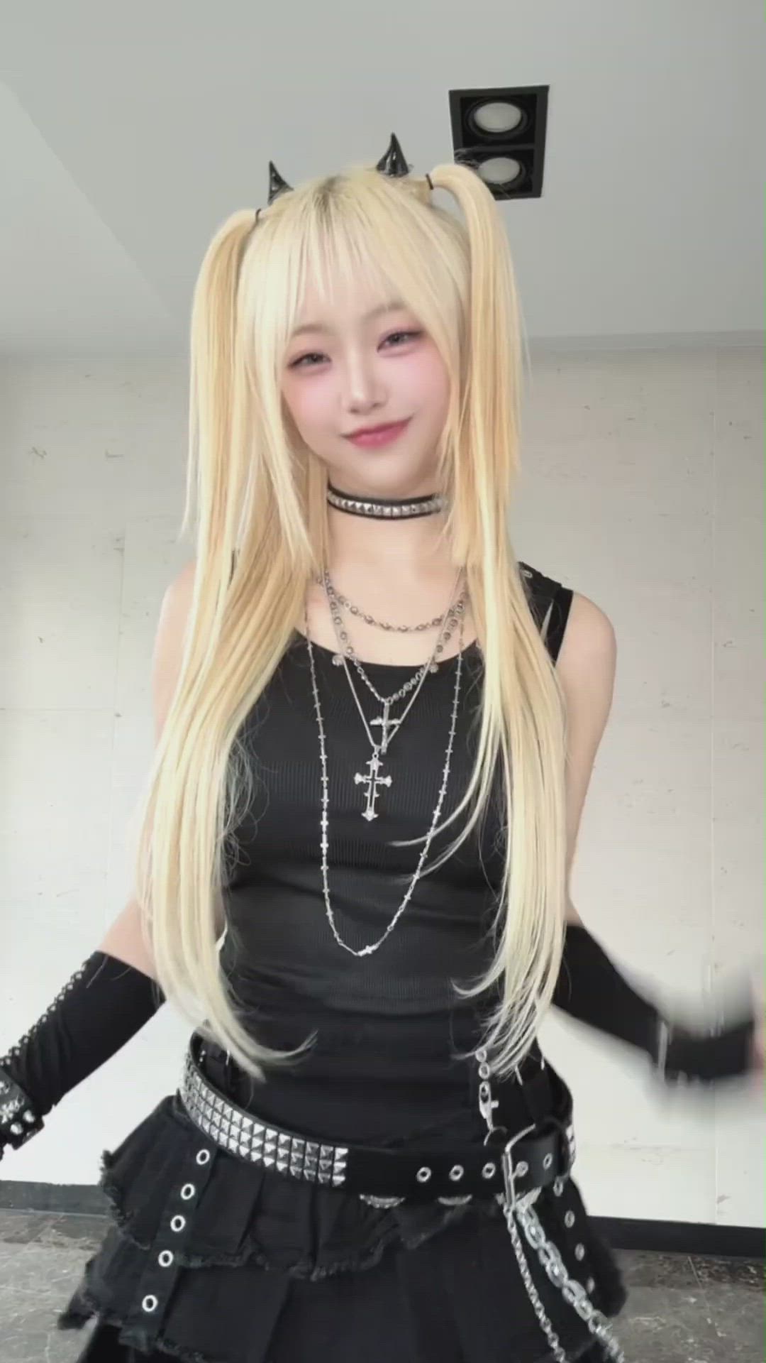 Around her neck, Jeewon wears a black studded choker and multiple strands of silver layered necklaces. A cross pendant is particularly prominent, further enhancing the gothic ambiance. She sports devil horn hair clips, adding a playful charm to her look, and black fingerless gloves with stud details on her arms complete the punk mood. Edgy accessories like these can be discovered at brands like Chrome Hearts or Givenchy.