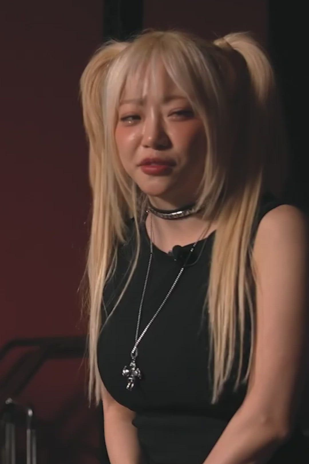Jeewon presents an outfit that harmoniously blends punk style and a gothic aesthetic, primarily featuring a black fashion theme. She pairs a sleeveless top with silver-toned accessories like a choker and a long cross pendant necklace, emphasizing a powerful and rock chic appeal. Her bright blonde pigtails offer a playful and unique contrast to the overall dark attire.