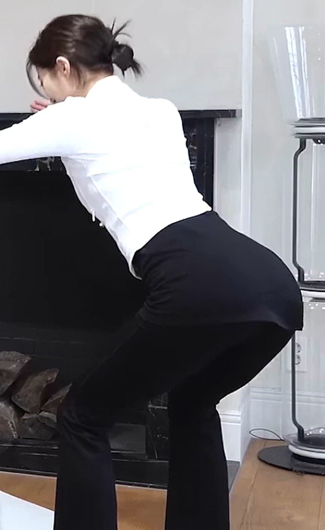 Black slim-fit pants are worn. They appear to have a straight or bootcut silhouette that falls gracefully along the leg line, and the stretchy material enhances mobility. A black mini-skirt-like detail is layered around the waist, adding a point of interest and avoiding monotony. You can find pants suitable for this business casual look at brands such as Aritzia or Uniqlo.
