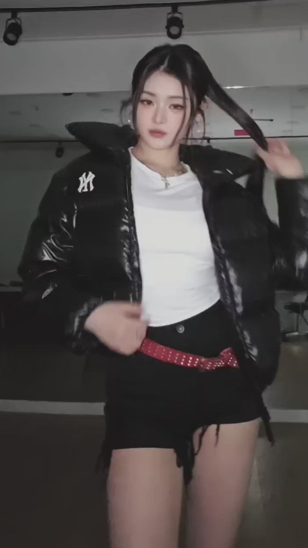 FIFTY FIFTY's Athena presents a casual yet bold streetwear style. She pairs a glossy black puffer jacket with short denim shorts, creating an active vibe. A striking red studded belt adds a key accent to the look, completing an overall hip and edgy aesthetic. This outfit masterfully combines comfort with trendiness, showcasing a keen fashion sense.