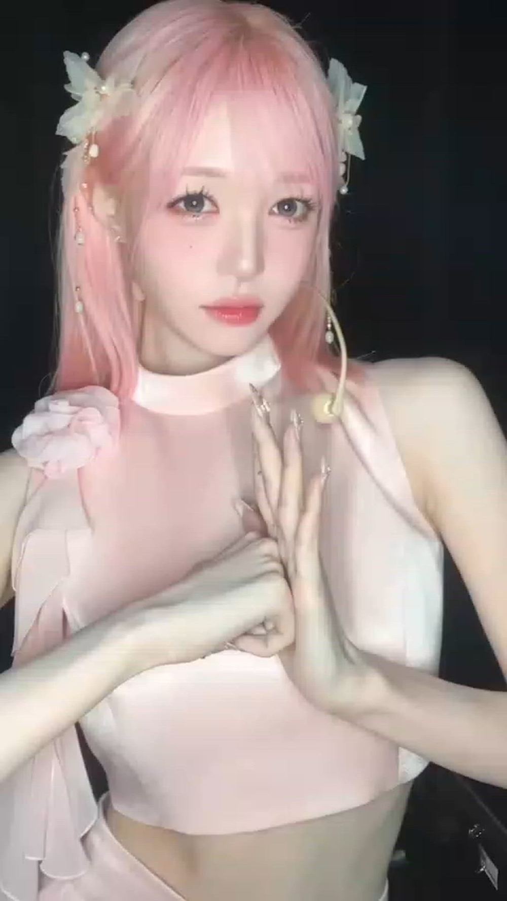 triples-Chaewon은 파스텔핑크 톤의 무대 의상으로 사랑스럽고 몽환적인 분위기를 연출하고 있습니다. 전체적으로 여성스러운 실루엣과 섬세한 디테일이 돋보이는 페미닌룩을 선보이며, 가볍고 하늘거리는 소재를 활용하여 요정 같은 이미지를 강조합니다. 특히 상의의 어깨 장식과 헤어 액세서리는 의상의 매력을 한층 더 높여줍니다. 밝은 색상의 헤어스타일과 조화를 이루어 화사하고 부드러운 인상을 전달합니다.
