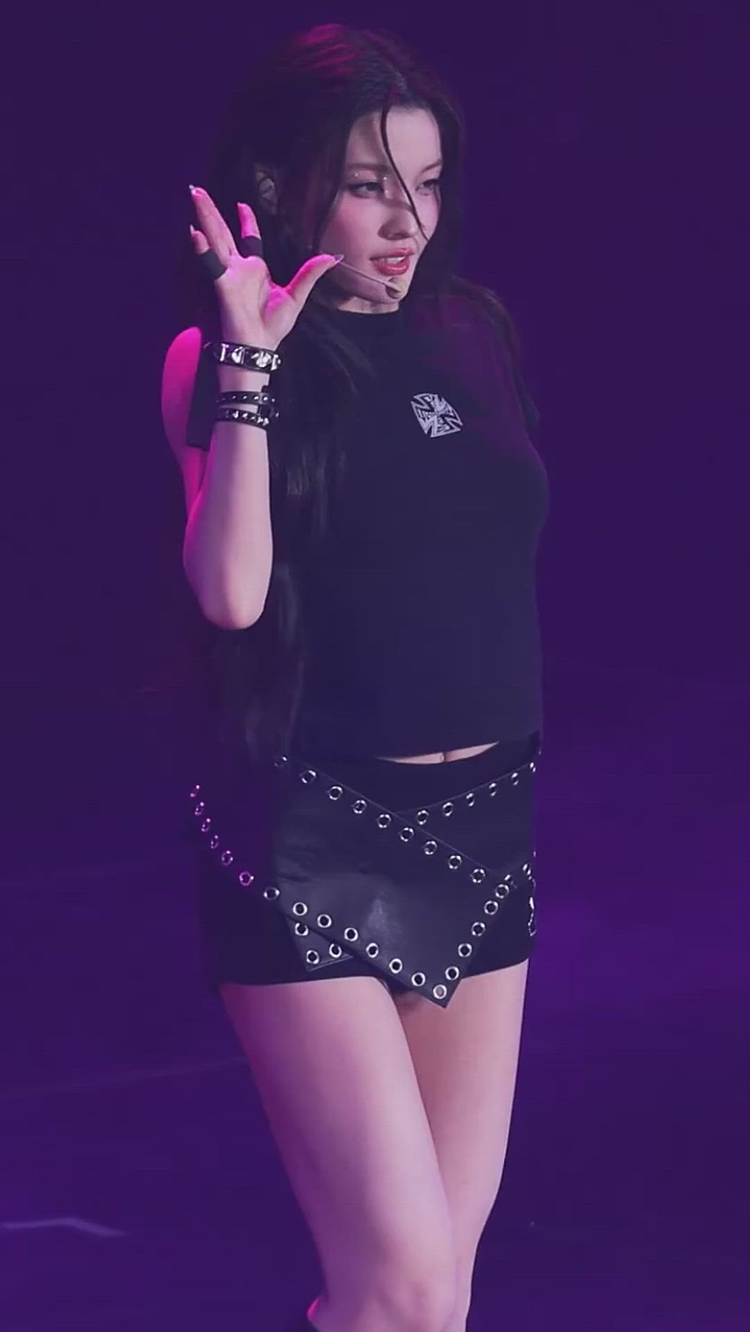Iroha showcases a powerful and rock chic style on stage. She pairs a black crop top with a leather mini skirt featuring metal eyelet details, creating a chic yet vibrant atmosphere. The overall black color palette provides a cohesive look, complemented by layered bracelets and a ring that add distinctive accents to her stage outfit.
